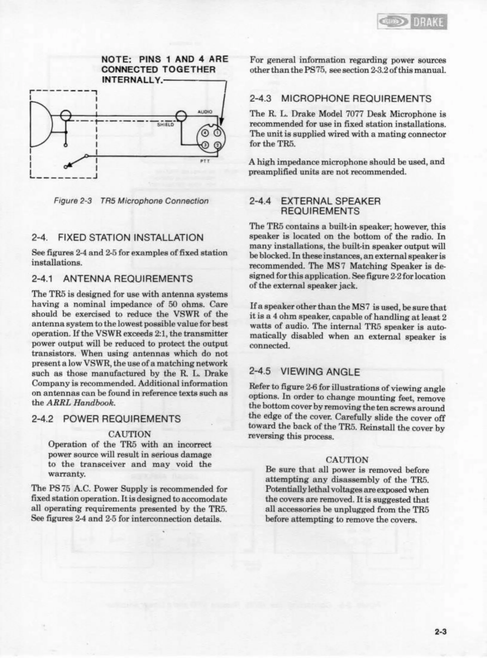 DRAKE TR5 - Fixed Station Installation; Antenna Requirements; Power Requirements; Microphone Requirements