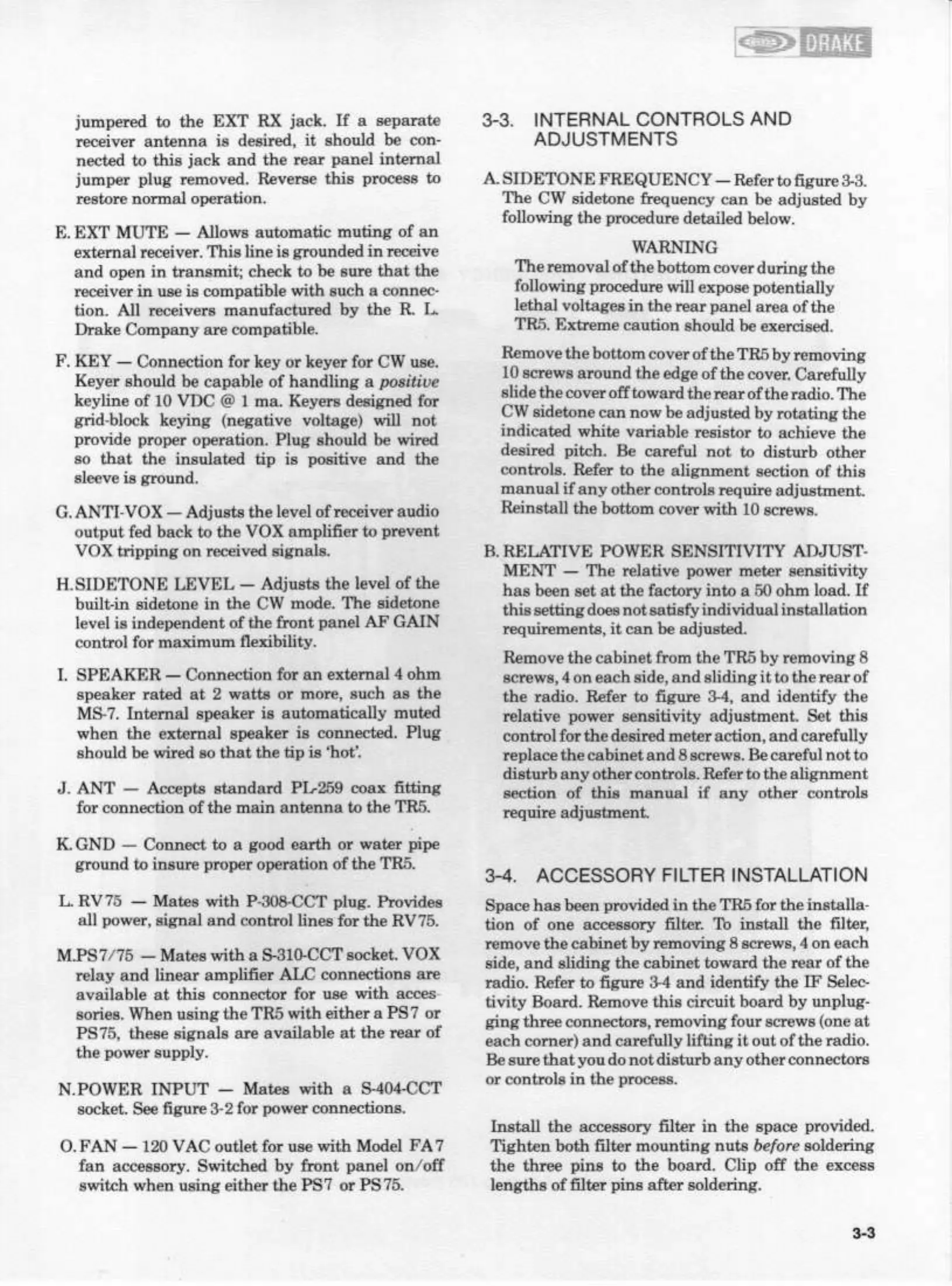 DRAKE TR5 - Internal Controls and Adjustments; Accessory Filter Installation