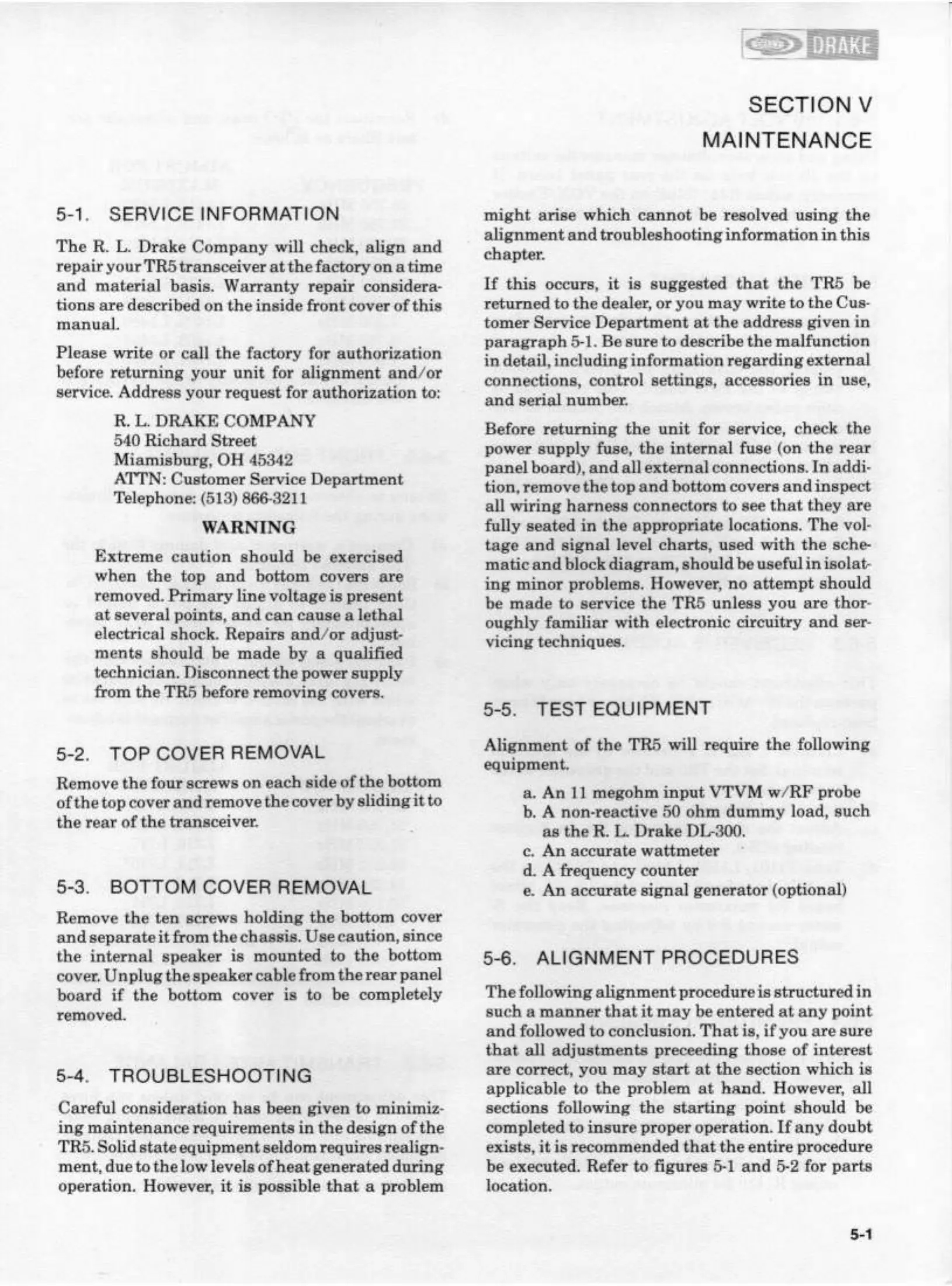 DRAKE TR5 - Maintenance; Service Information; Top Cover Removal; Bottom Cover Removal