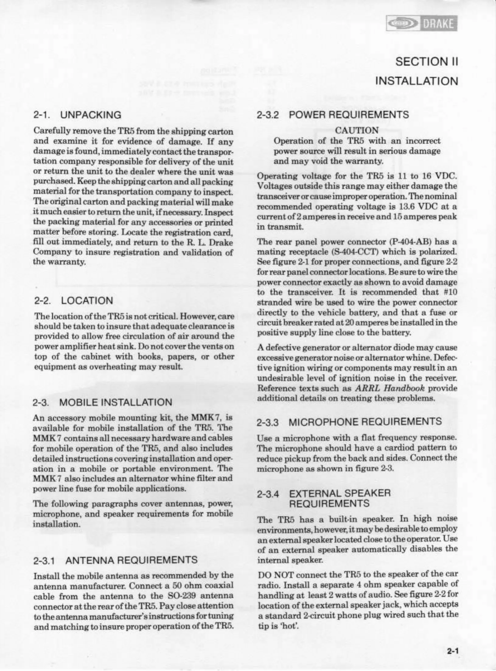 DRAKE TR5 - Installation; Unpacking; Location; Mobile Installation
