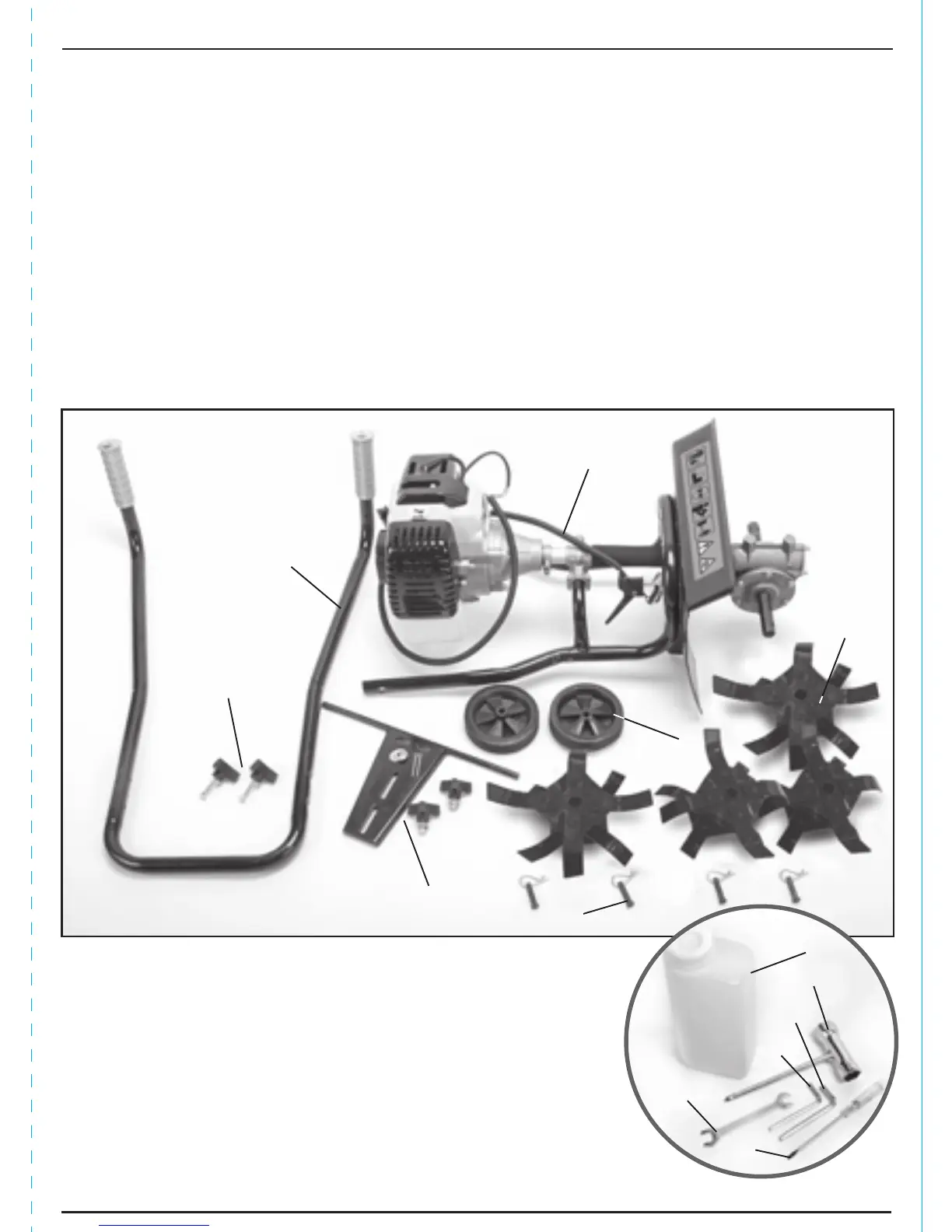 As well as the cultivator/tiller, there are several parts not fitted or attached to it.