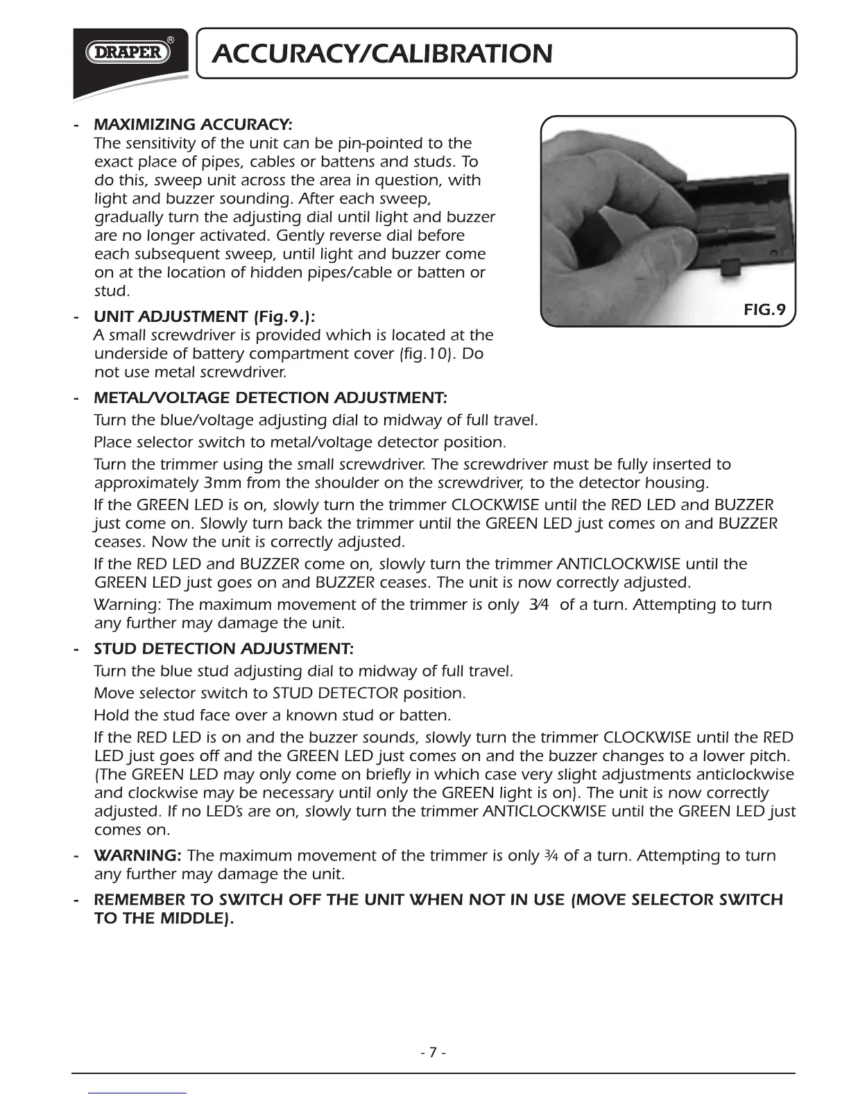 Draper 501D - ACCURACY AND CALIBRATION; METAL;VOLTAGE DETECTION CALIBRATION; STUD DETECTION CALIBRATION