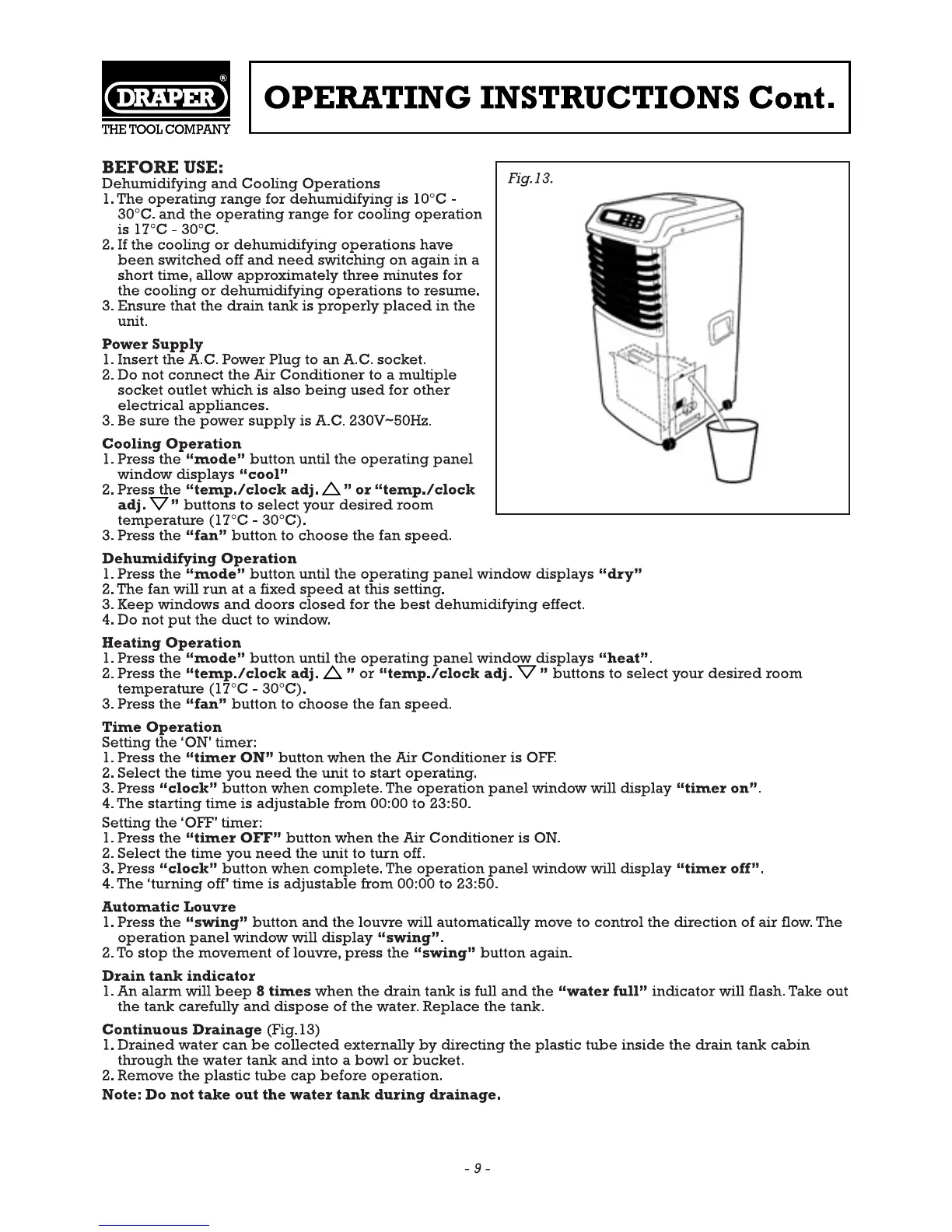 Draper AC9000 - Operating Instructions Continued; Cooling Operation; Dehumidifying Operation; Heating Operation