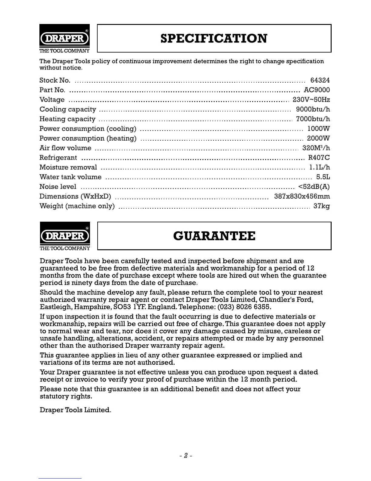 Draper AC9000 - Specification