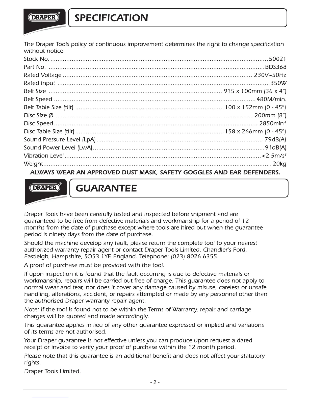 Draper BDS368 - Belt and Disc Sander Specifications; Draper Sander Guarantee Information