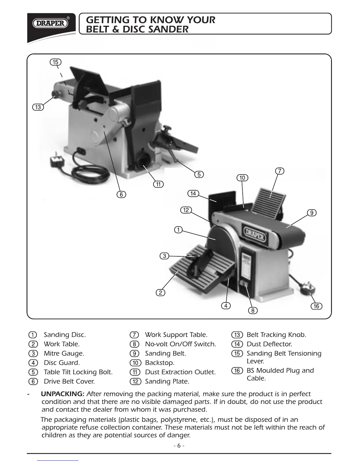Draper BDS368 - Getting to Know Your Belt and Disc Sander; Component Identification; Unpacking and Inspection