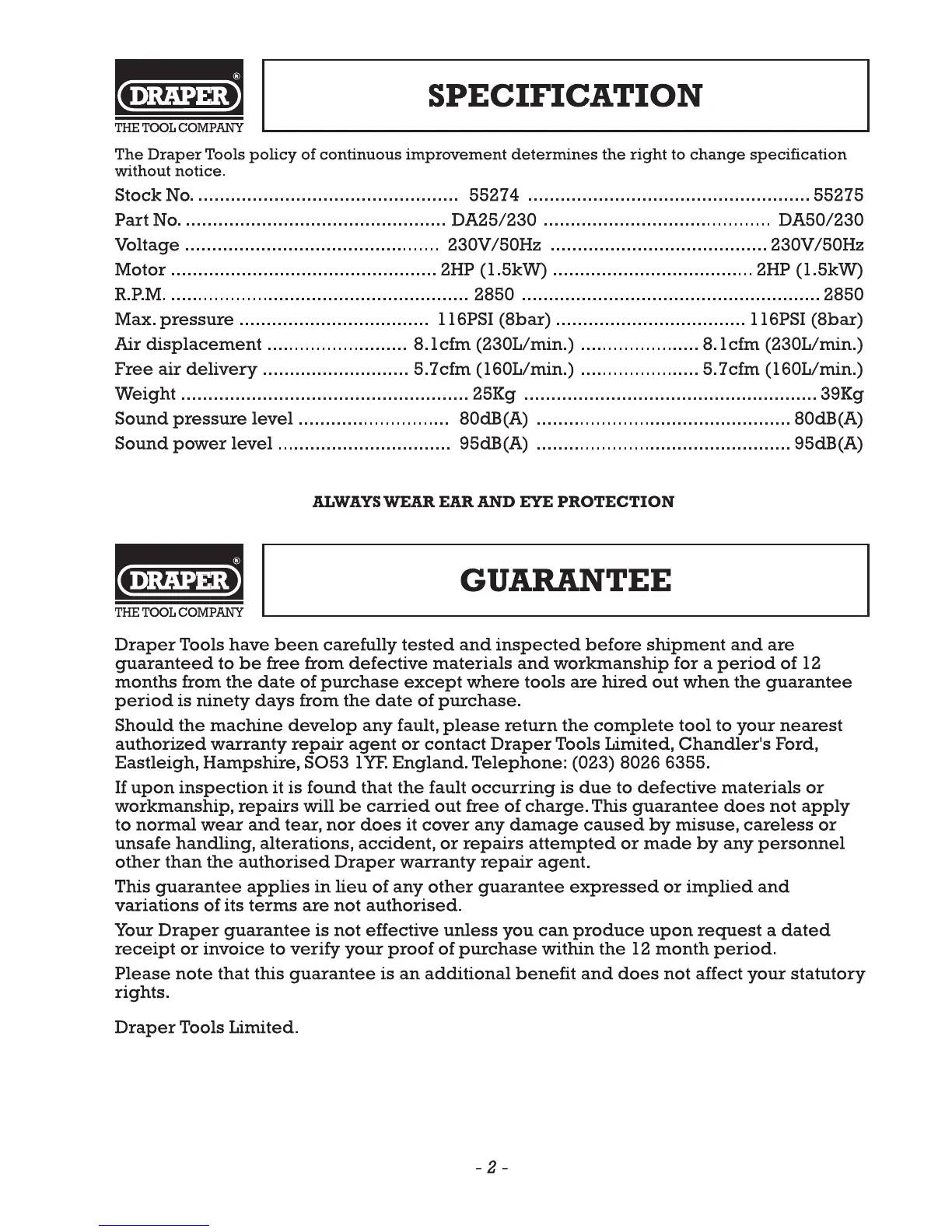 Draper DA25/230 - Specification; Guarantee