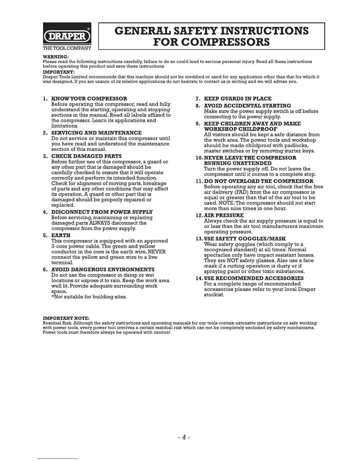 Draper DA25/230 - General Safety Instructions; Pre-Operation and Maintenance Safety; Safe Operating Environment and Practices; Personal Safety and Supervision