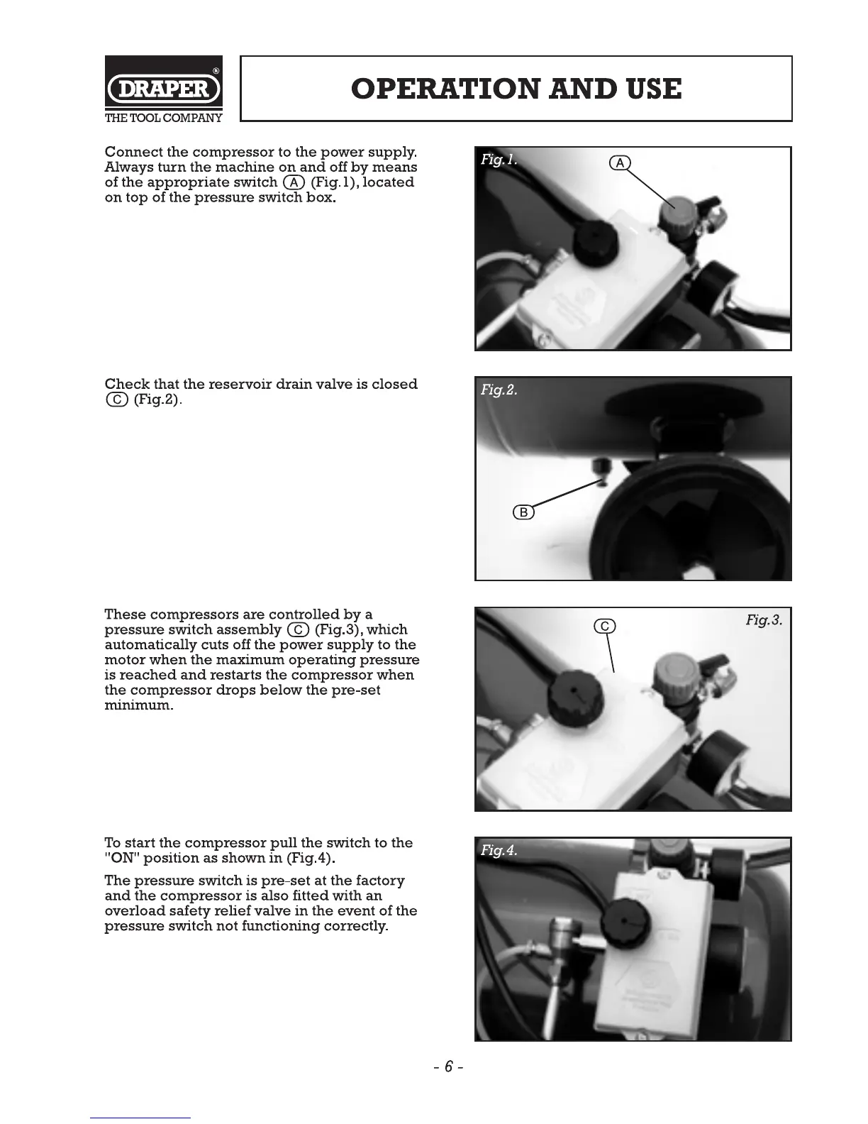 Draper DA25/230 - Operation and Use; Connecting and Starting the Compressor; Pressure Switch Operation
