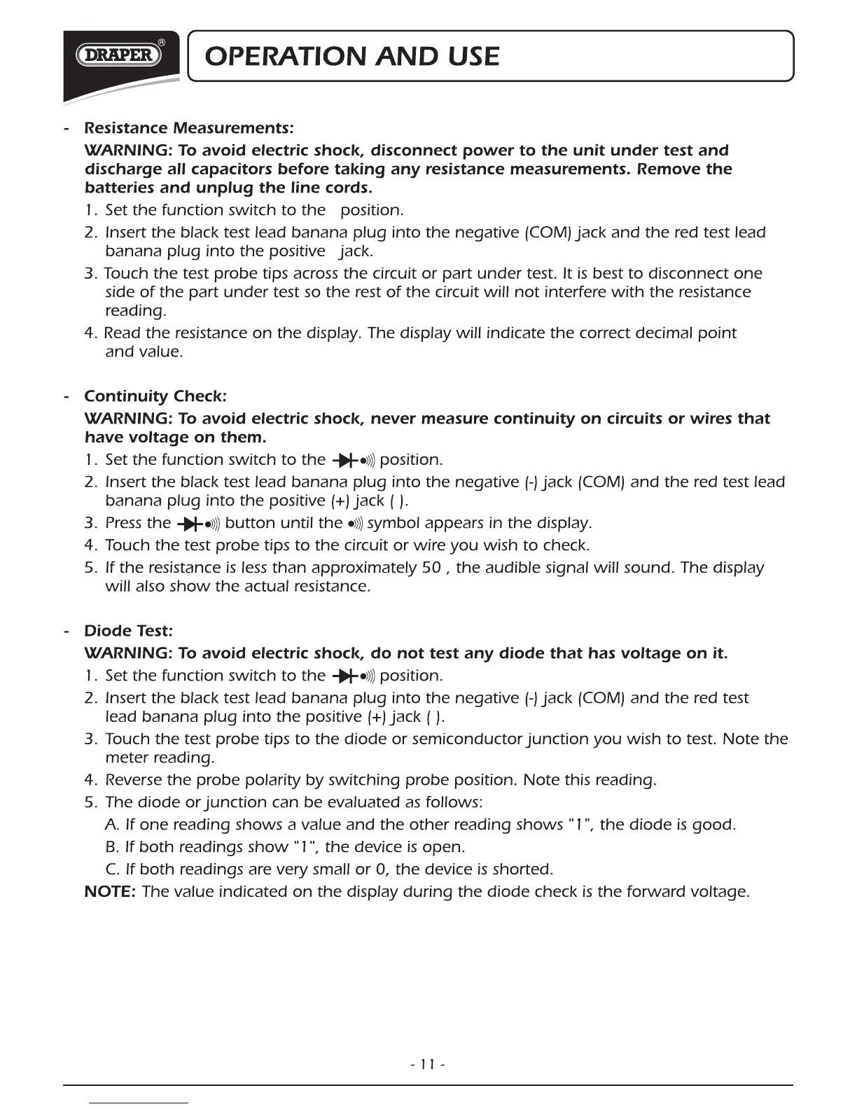 Draper DMM10B - Resistance Measurements; Continuity Check; Diode Test
