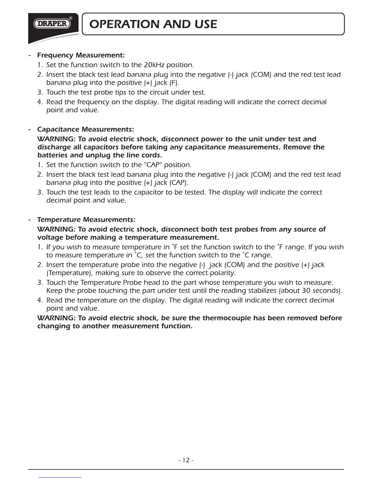 Draper DMM10B - Frequency Measurement; Capacitance Measurement; Temperature Measurements