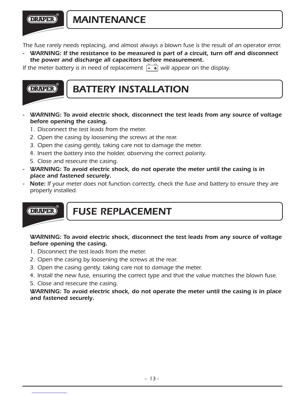 Draper DMM10B - Maintenance; Battery Installation; Fuse Replacement