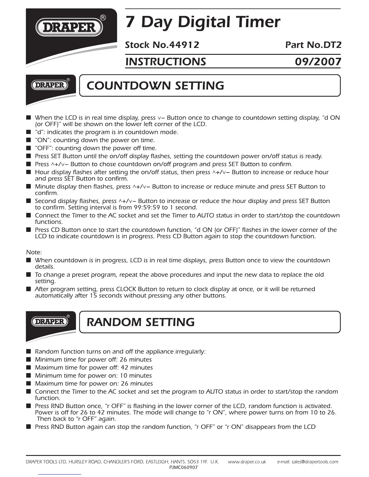 Draper DT2 - Advanced Timer Settings; Countdown Setting Procedure; Activating Countdown Function; Random Function Parameters