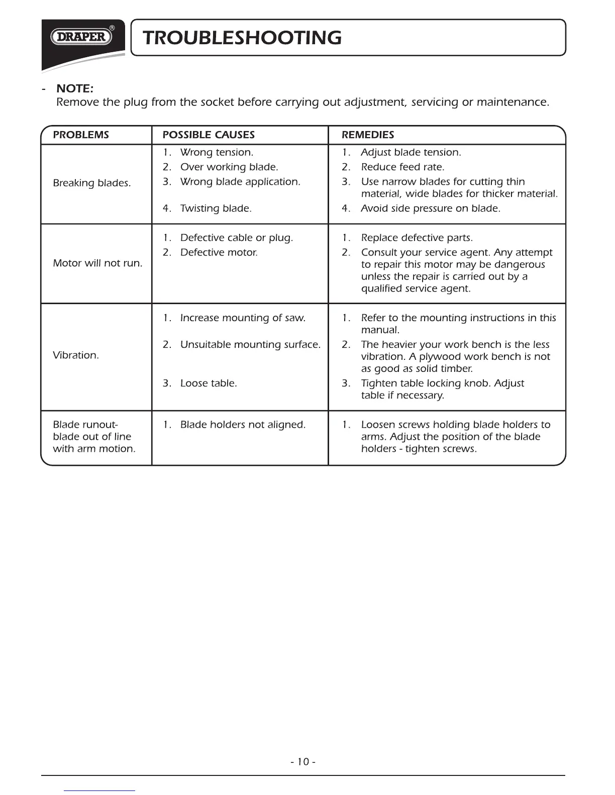 Draper FS16VA - TROUBLESHOOTING; Common Issues and Solutions