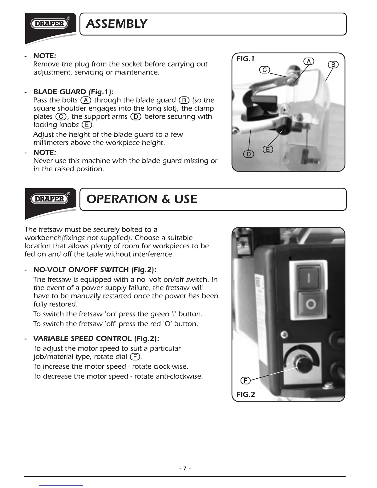 Draper FS16VA - ASSEMBLY; OPERATION & USE; No-Volt On;Off Switch; Variable Speed Control