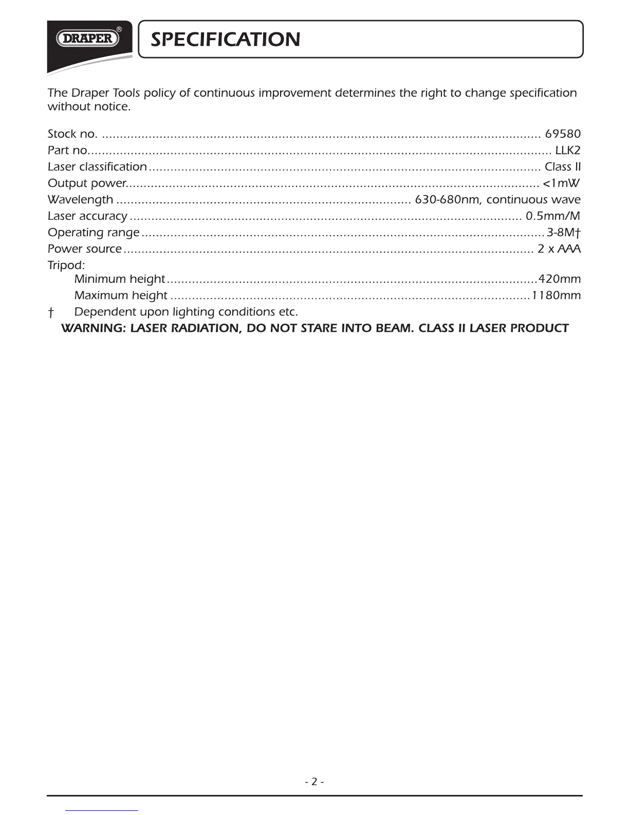 Draper LLK2 - Specification
