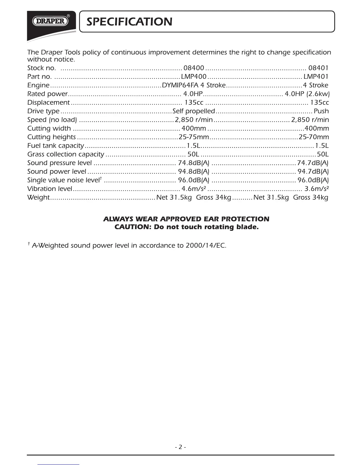 Draper LMP400 - Product Specifications; Technical Data; Safety Warnings for Operation