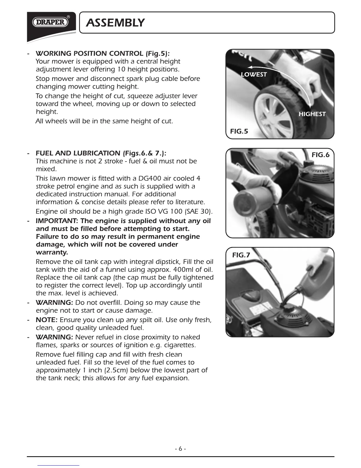 Draper LMP400 - Initial Setup and Lubrication; Adjusting Cutting Height; Engine Oil and Fueling
