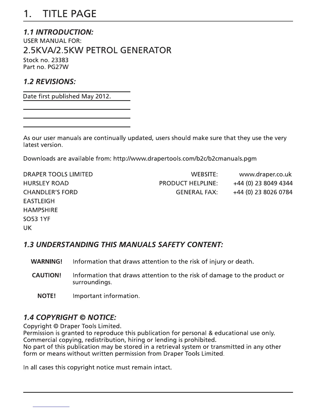 Draper PG27W - TITLE PAGE; INTRODUCTION; REVISION HISTORY; SAFETY CONTENT EXPLANATION