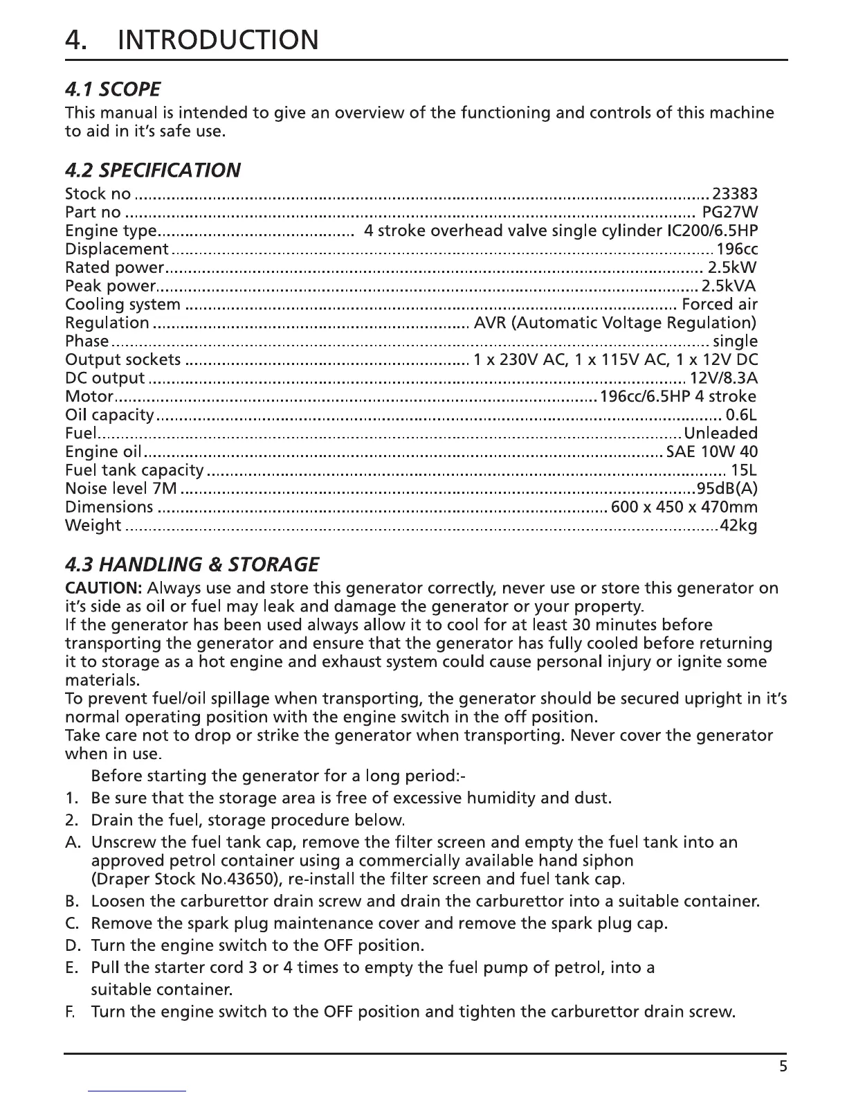 Draper PG27W - INTRODUCTION; SCOPE OF MANUAL; TECHNICAL SPECIFICATIONS; HANDLING AND STORAGE GUIDELINES