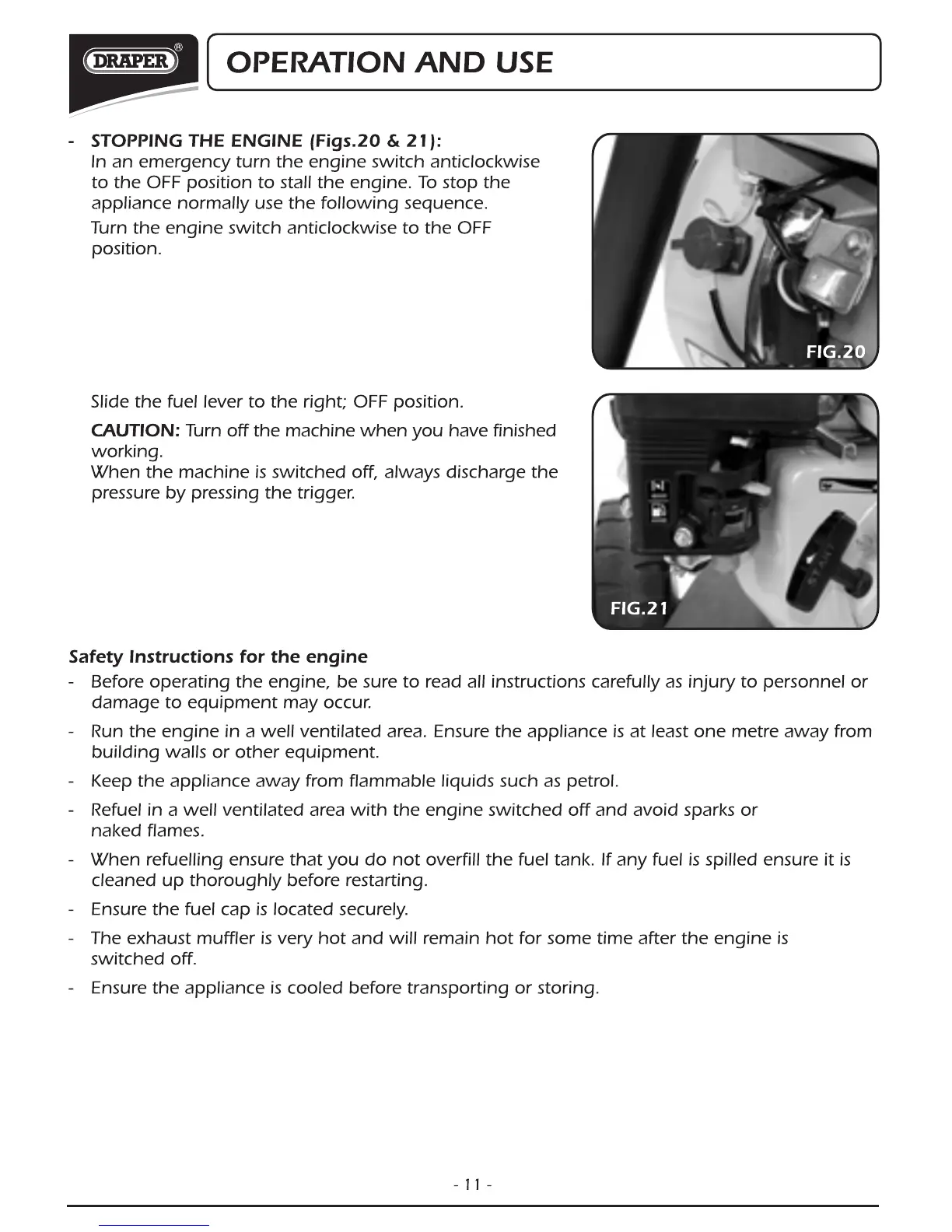 Draper PPW540 - Stopping the Engine; Safety Instructions for the Engine