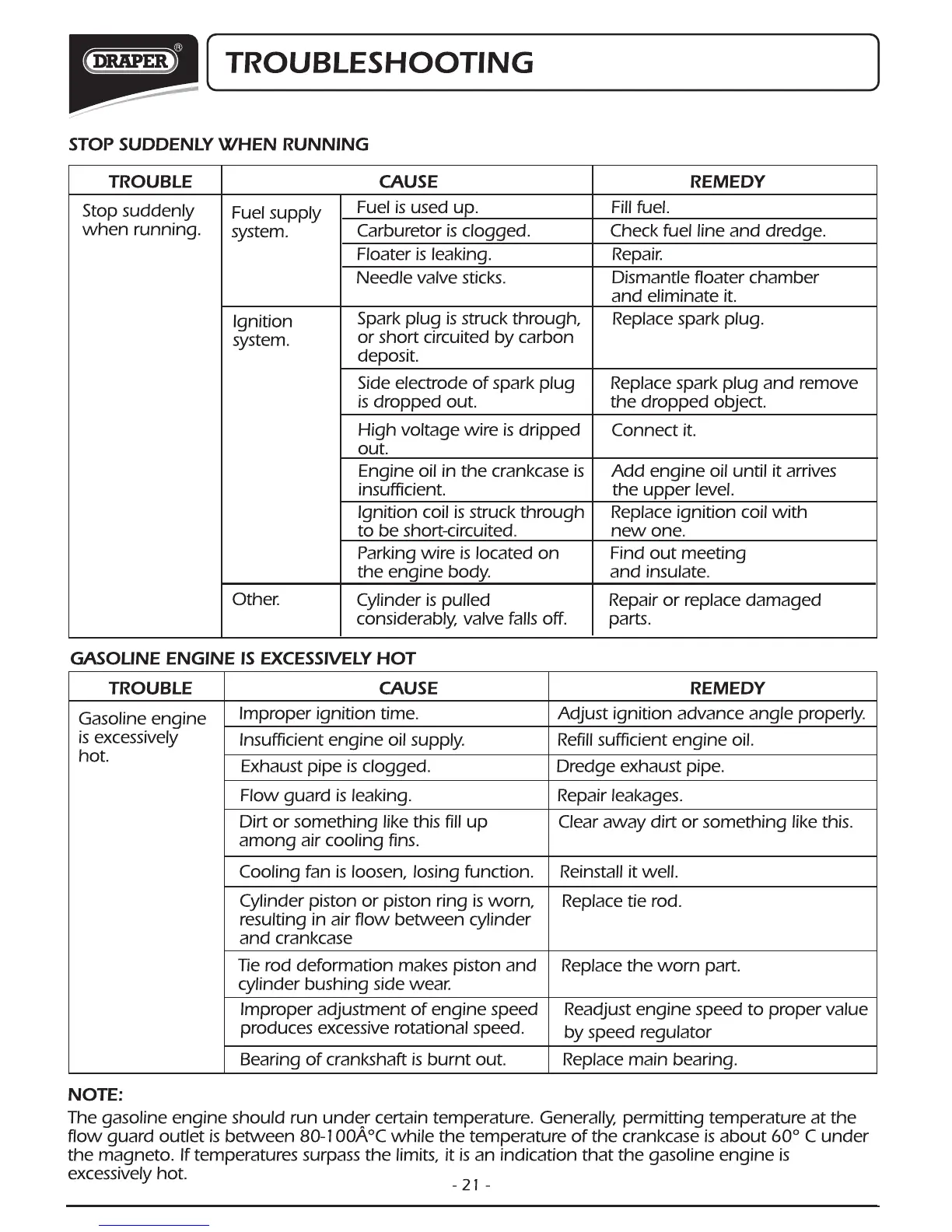 Draper PPW540 - Stop Suddenly When Running; Gasoline Engine Is Excessively Hot