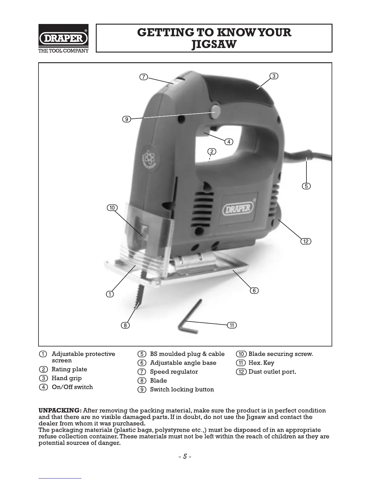 Draper PT450V - Getting to Know Your Jigsaw; Parts Identification; Unpacking and Initial Checks