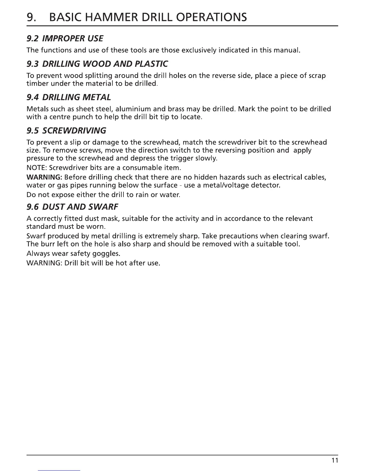 Draper PT600ID - PROHIBITED USES AND MISUSE; DRILLING GUIDELINES FOR VARIOUS MATERIALS; SCREWDRIVING OPERATION GUIDELINES; DUST AND SWARF HANDLING PRECAUTIONS