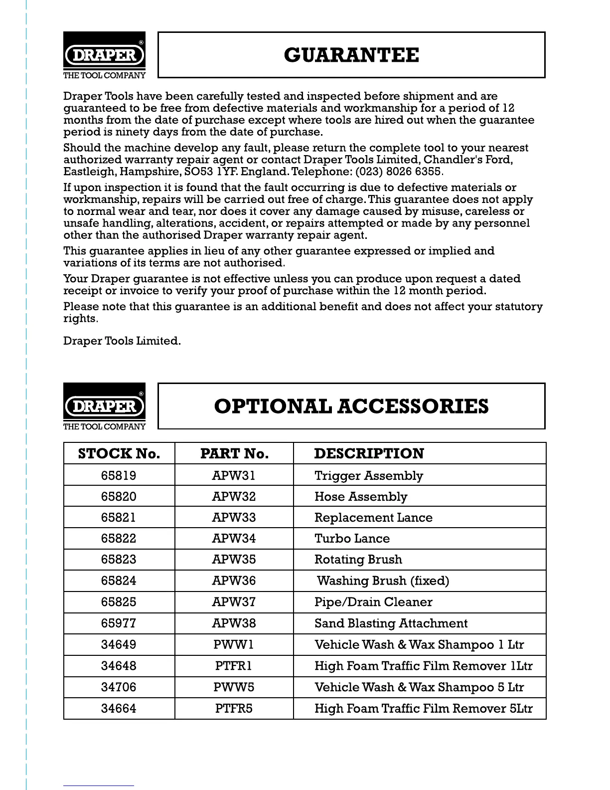 Draper PW2210 - GUARANTEE
