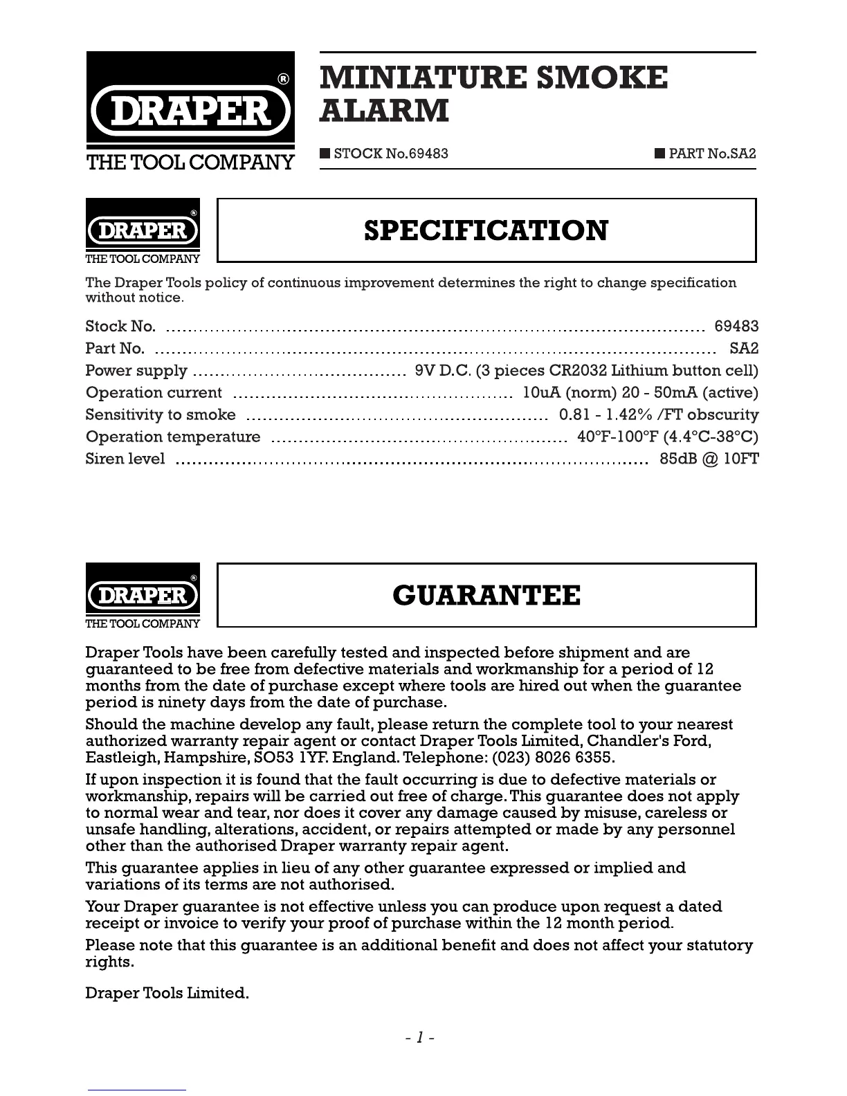 Draper SA2 - Technical Specifications; Product Guarantee Information