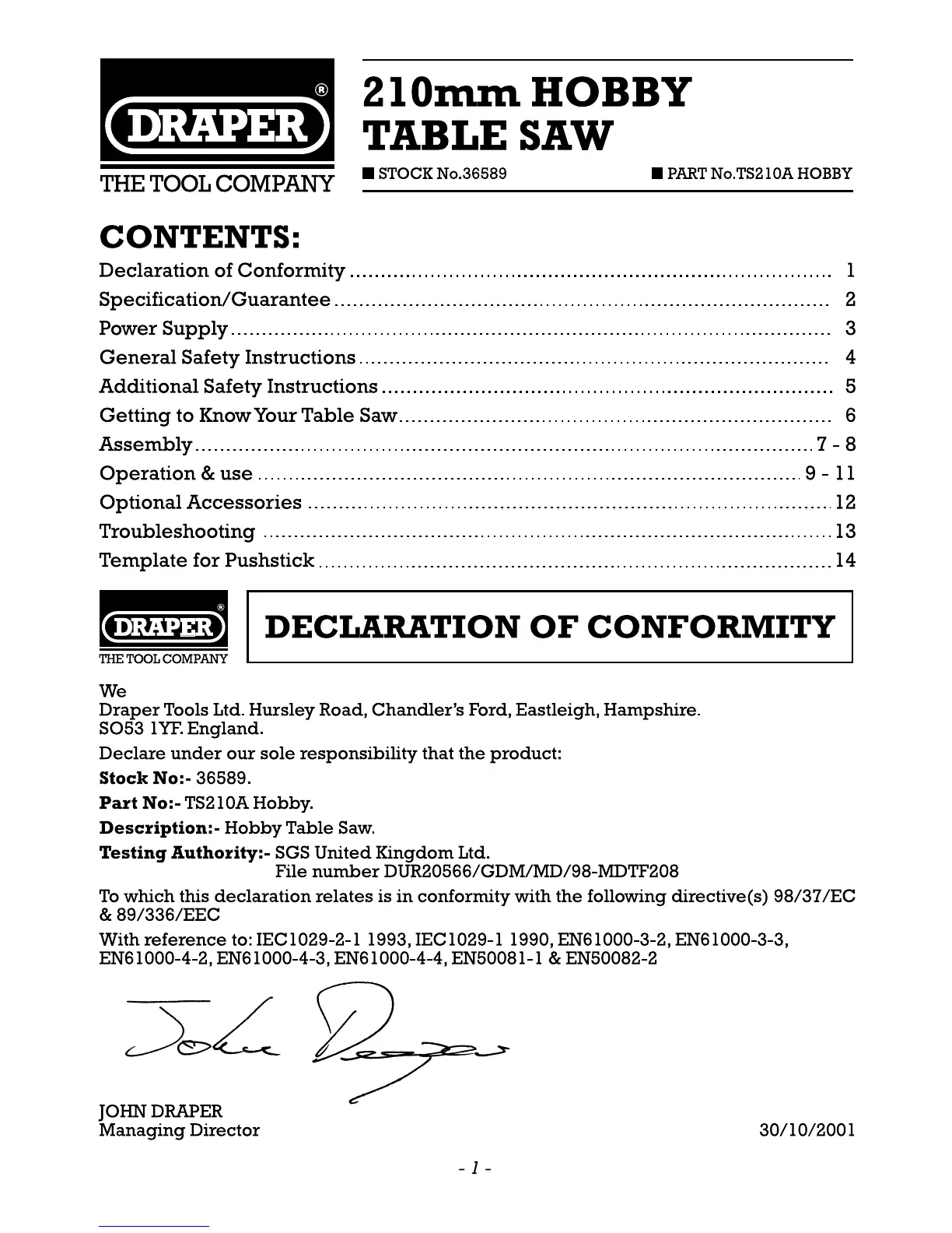 Draper TS210A Hobby - Declaration of Conformity