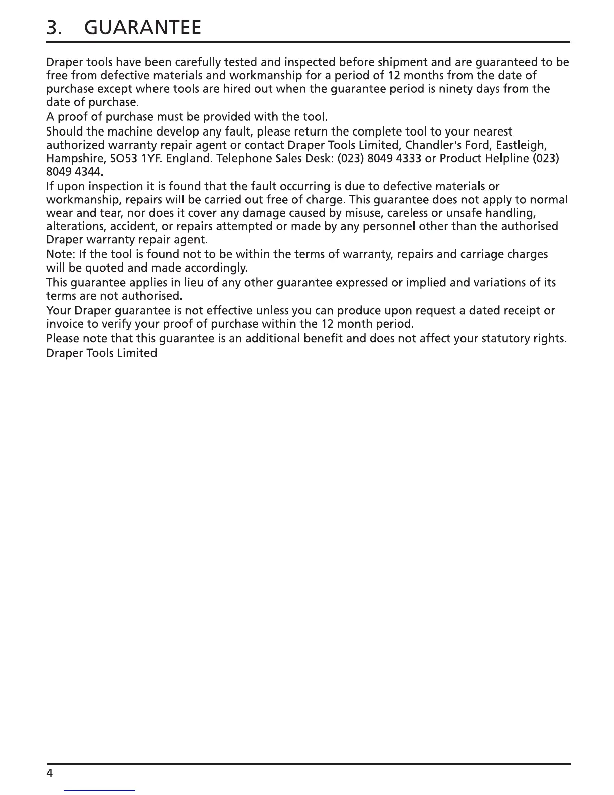 Draper WDV15A - GUARANTEE