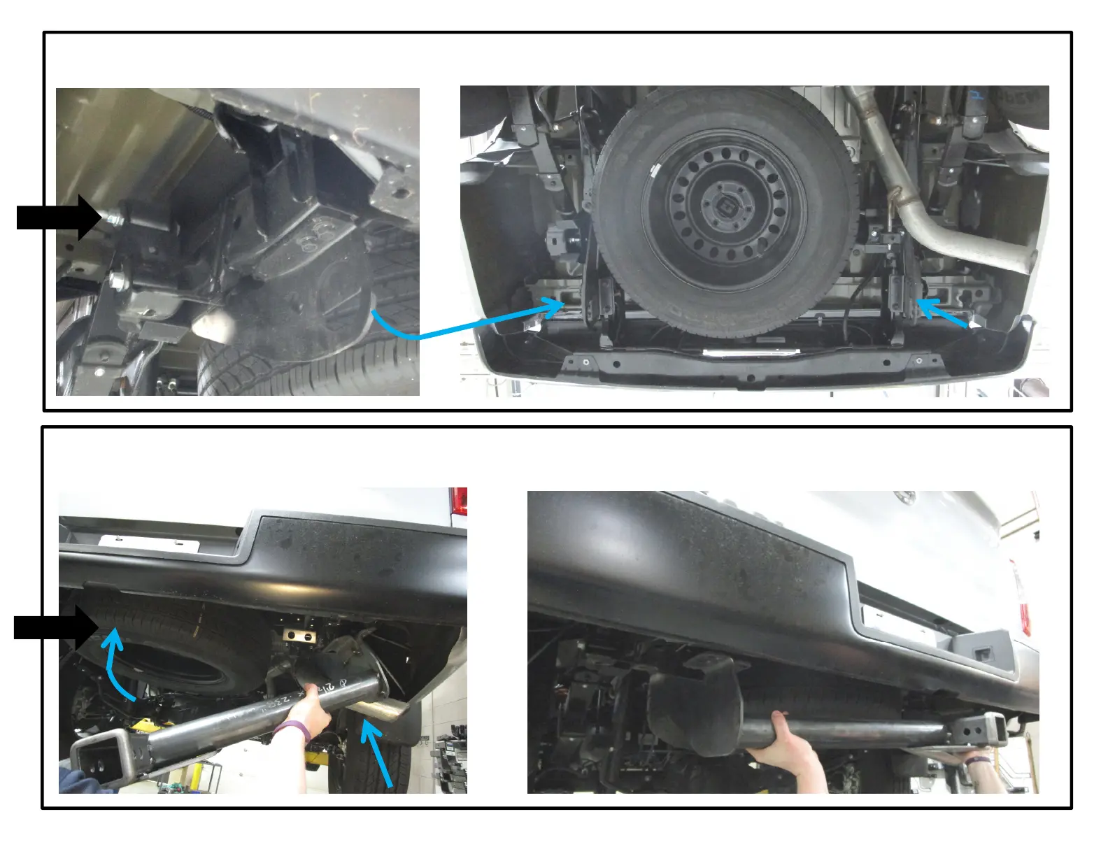2. Install hitch – Raise the hitch into position, raising the passenger’s side hitch bracket above the exhaust first, then raise the driver’s side into position.
