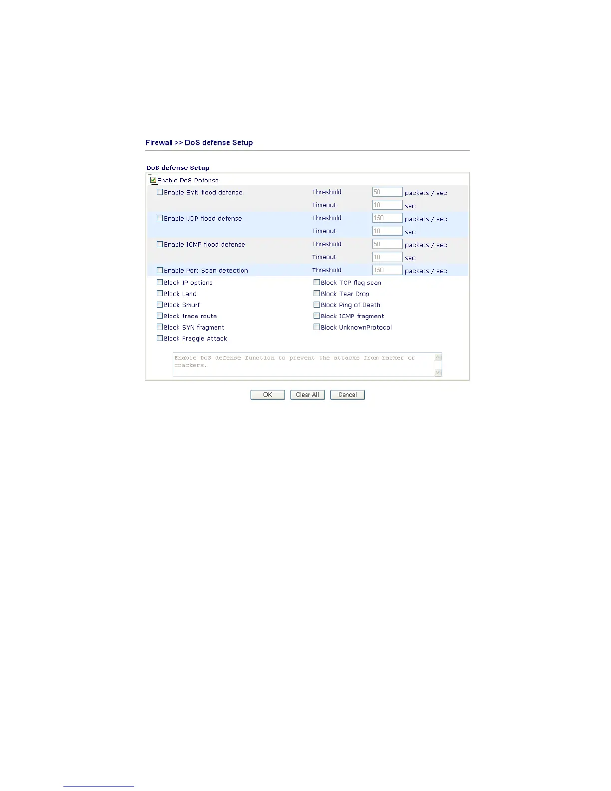 the DoS Defense setup. The DoS Defense functionality is disabled for default.