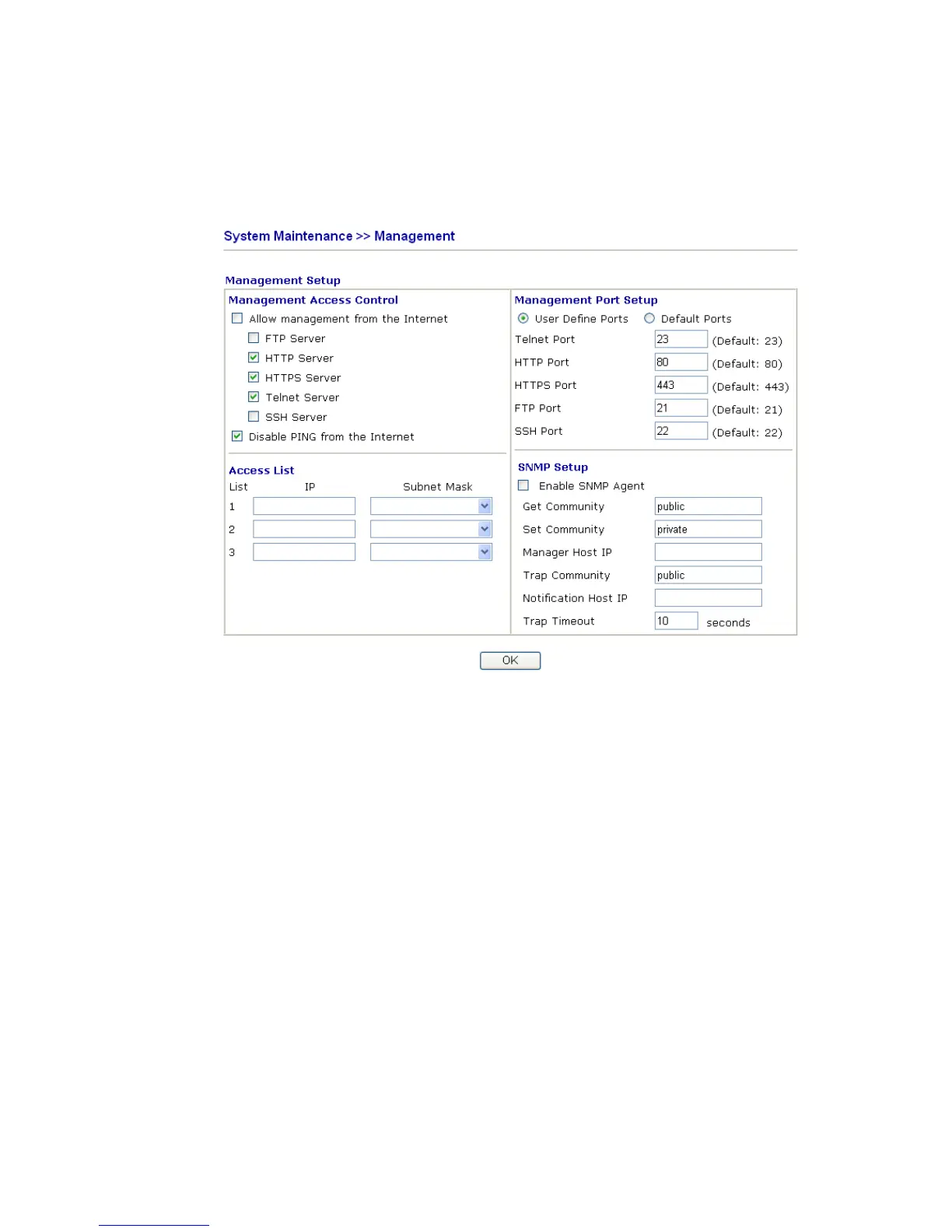 This page allows you to manage the settings for access control, access list, port setup, and