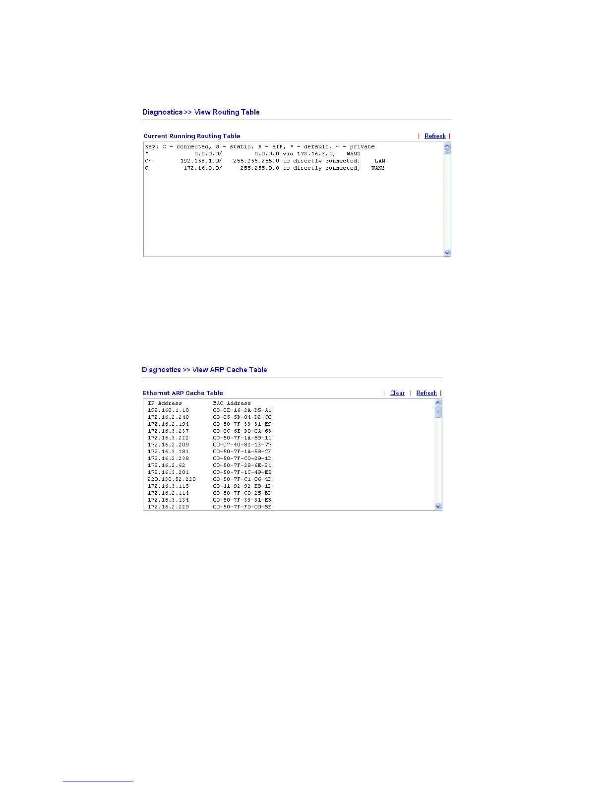 Click Diagnostics and click ARP Cache Table to view the content of the ARP (Address
