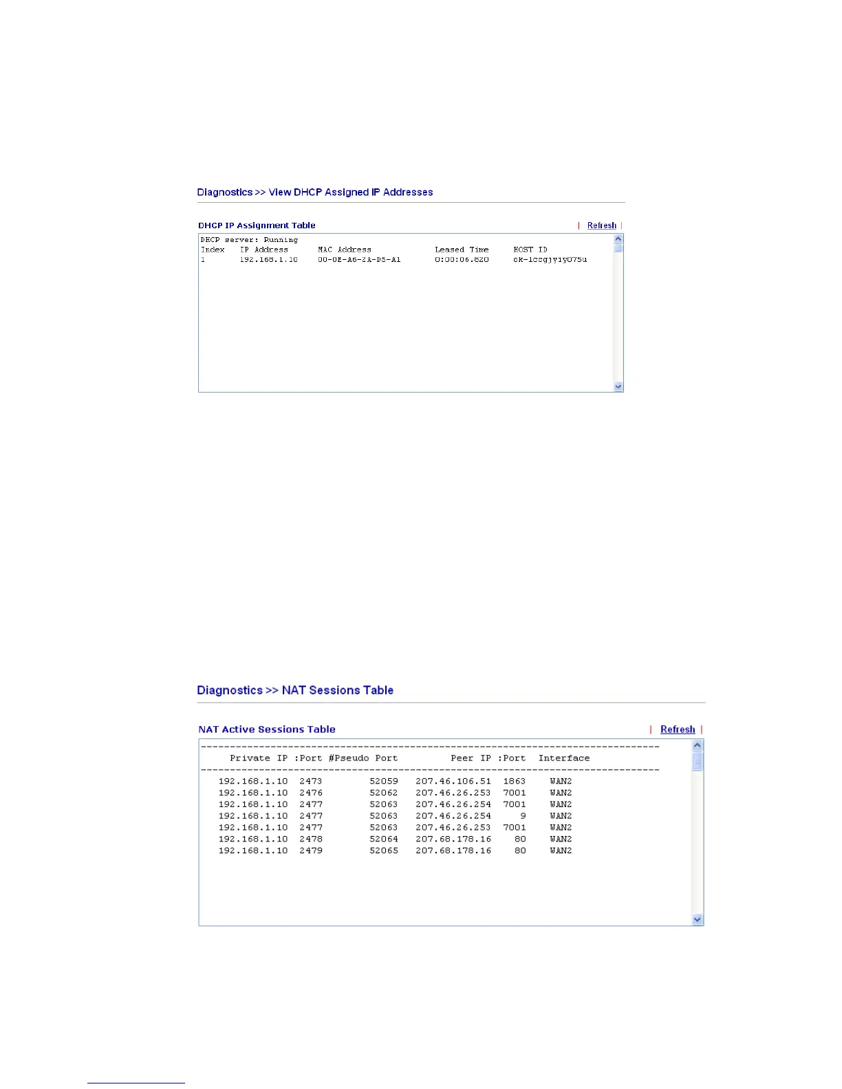 Click Diagnostics and click NAT Sessions Table to open the setup page.
