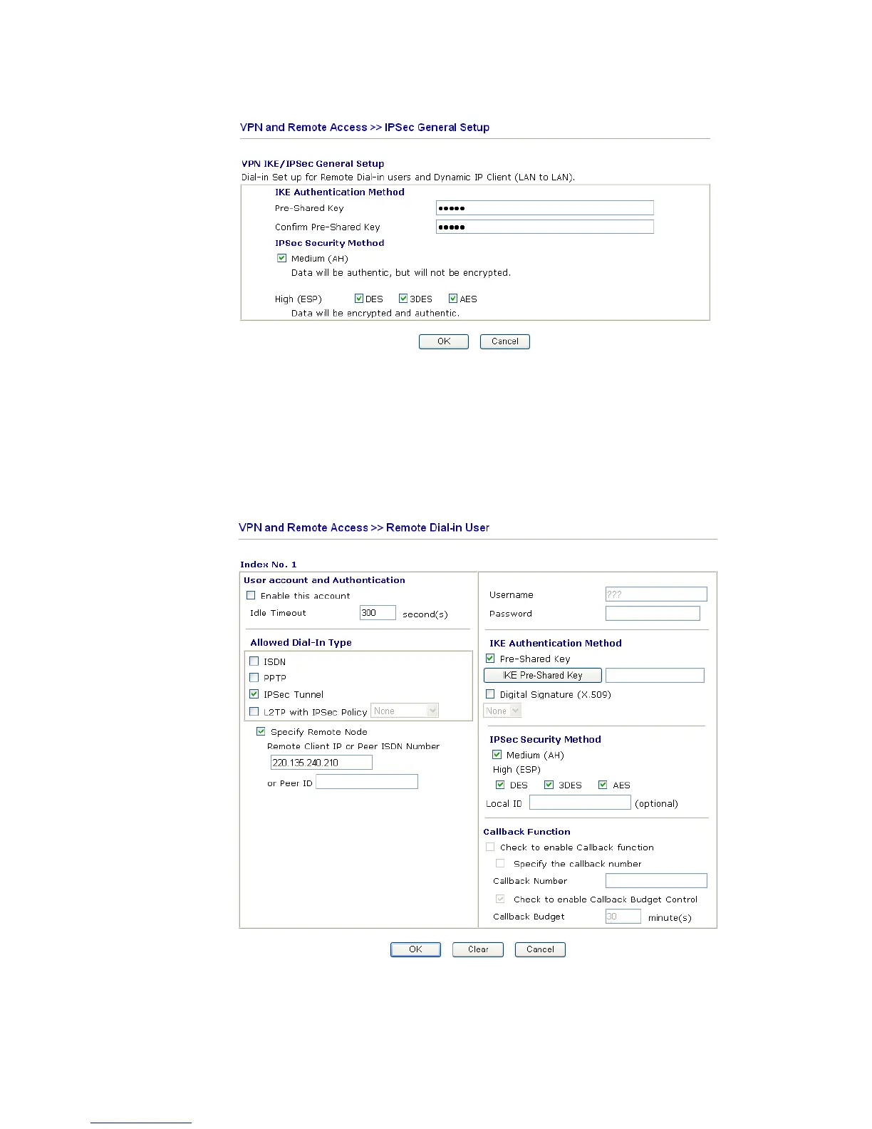 Address, IKE Authentication Method and IPSec Security Method for this Dial-In