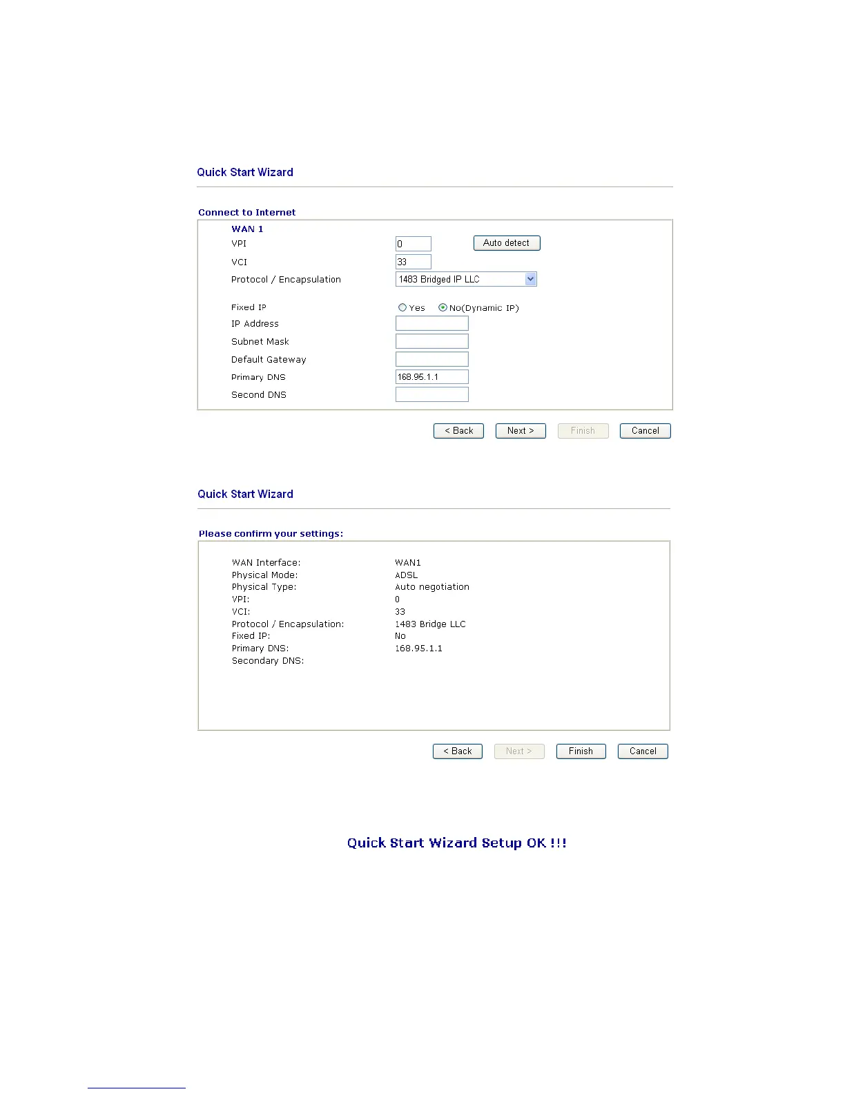 Click Finish. A page of Quick Start Wizard Setup OK!!! will appear. Then, the system