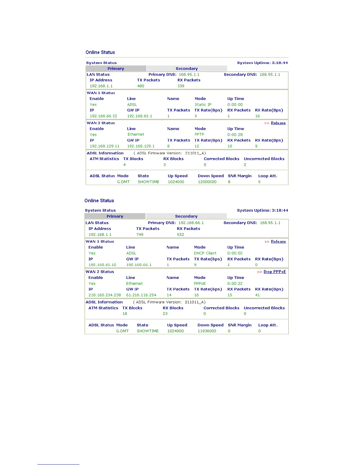 TX Packets Displays the total transmitted packets at the LAN interface.