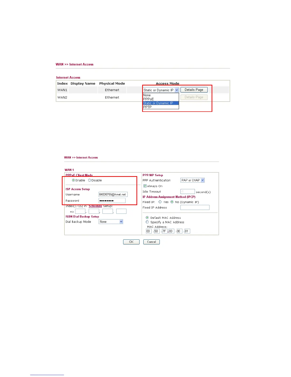 Open WAN >> Internet Access page and then check whether the ISP settings are set