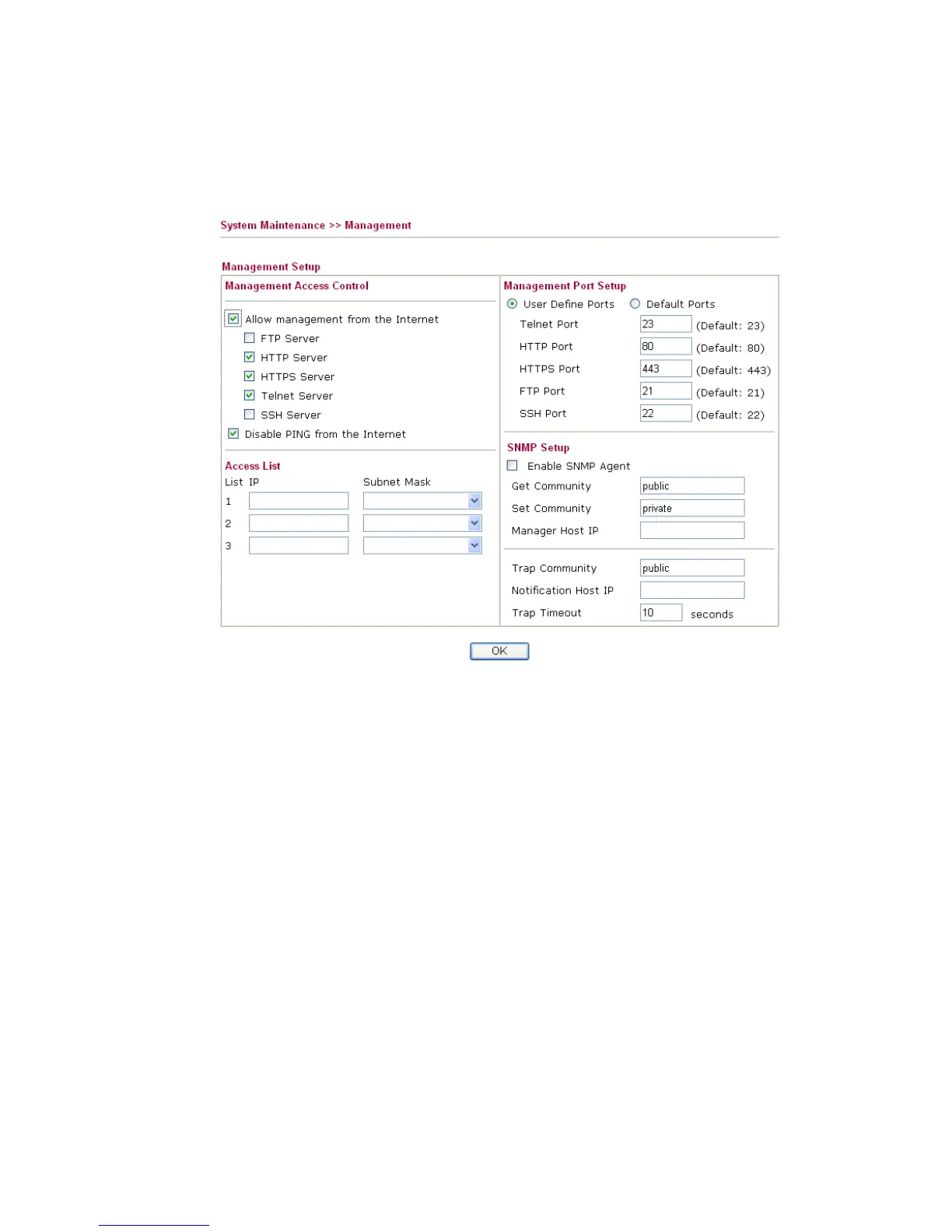 SNMP setup. For example, as to management access control, the port number is used to