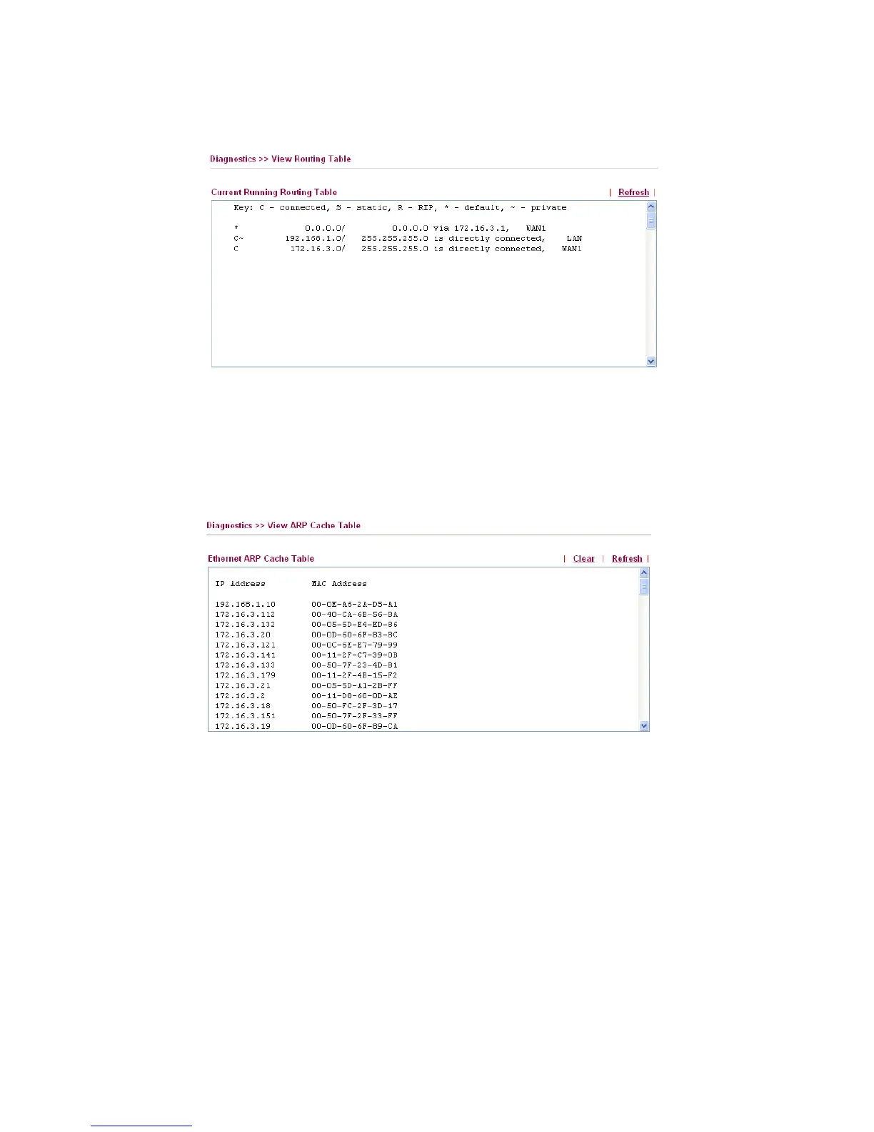 Click Diagnostics and click ARP Cache Table to view the content of the ARP (Address