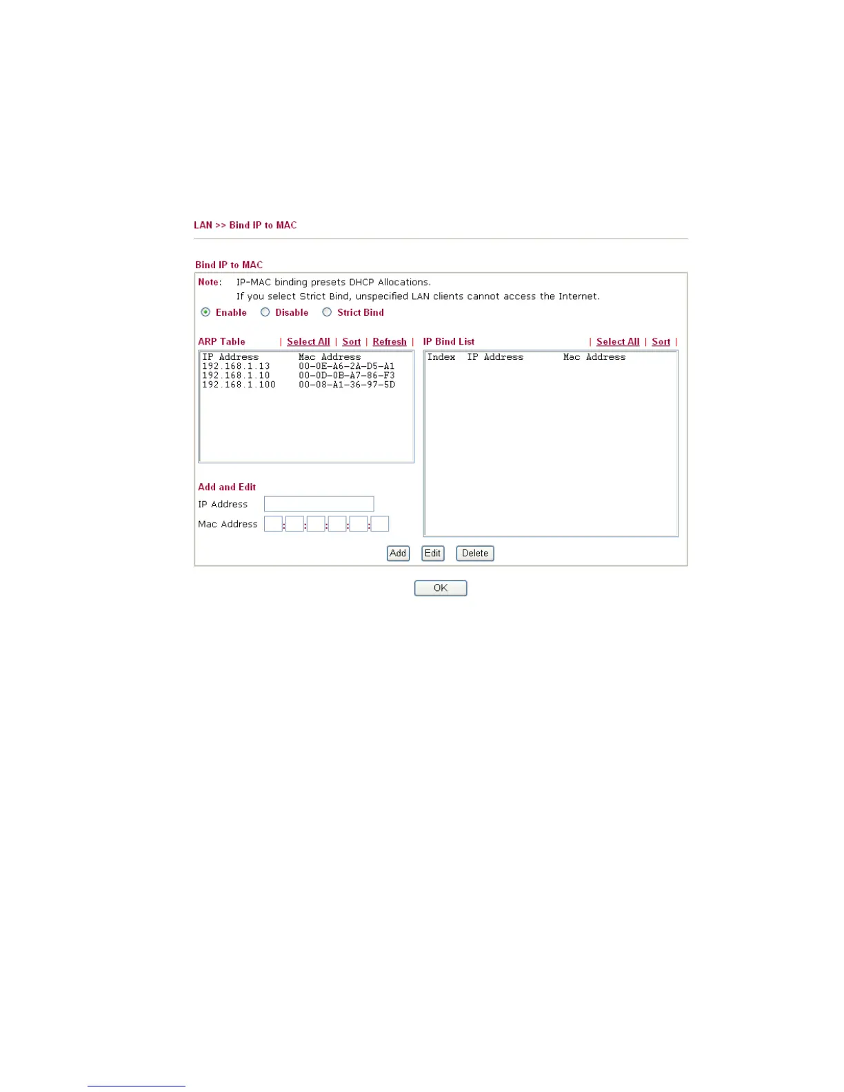 Strict Bind Click this radio button to block the connection of the IP/MAC