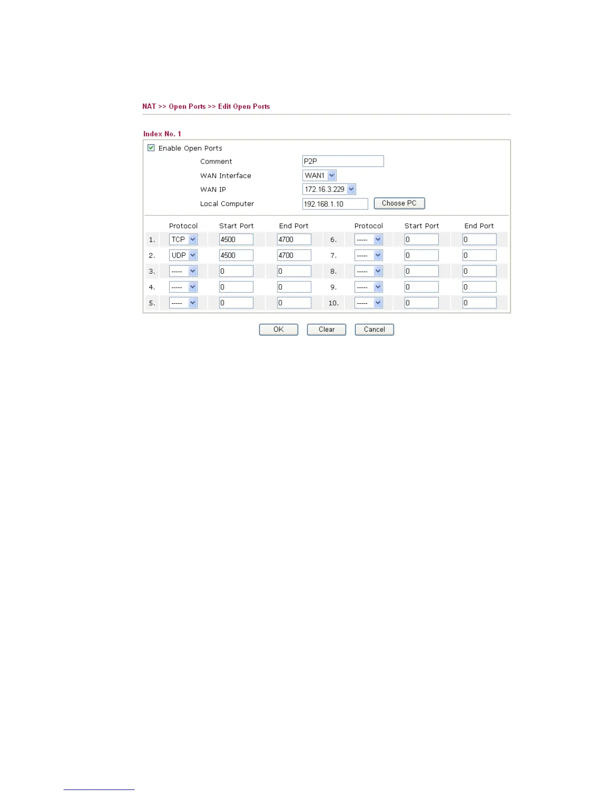 will pop up. In each index entry, you can specify 10 port ranges for diverse services.