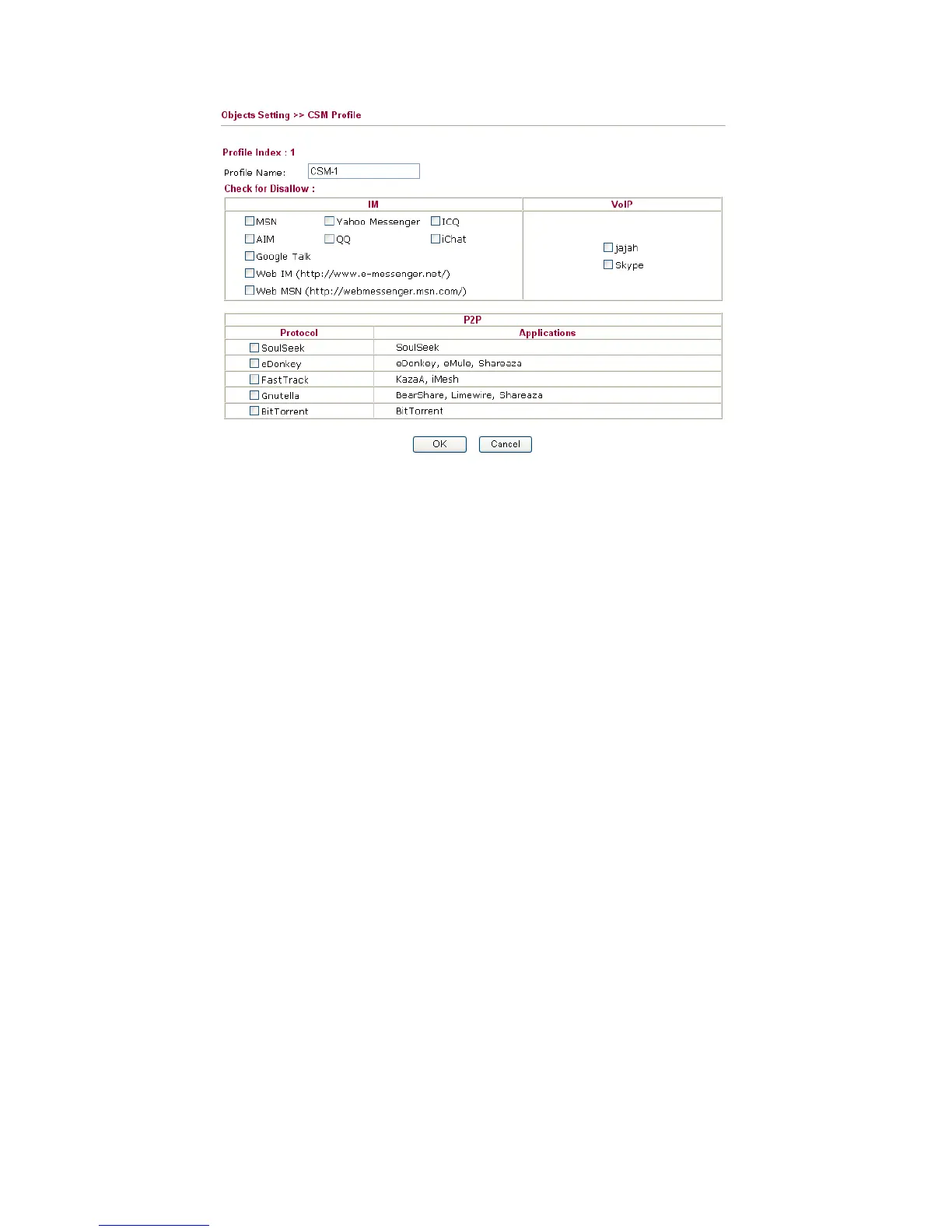 There are several items for IM, VoIP, P2P provided here for you to choose to disallow