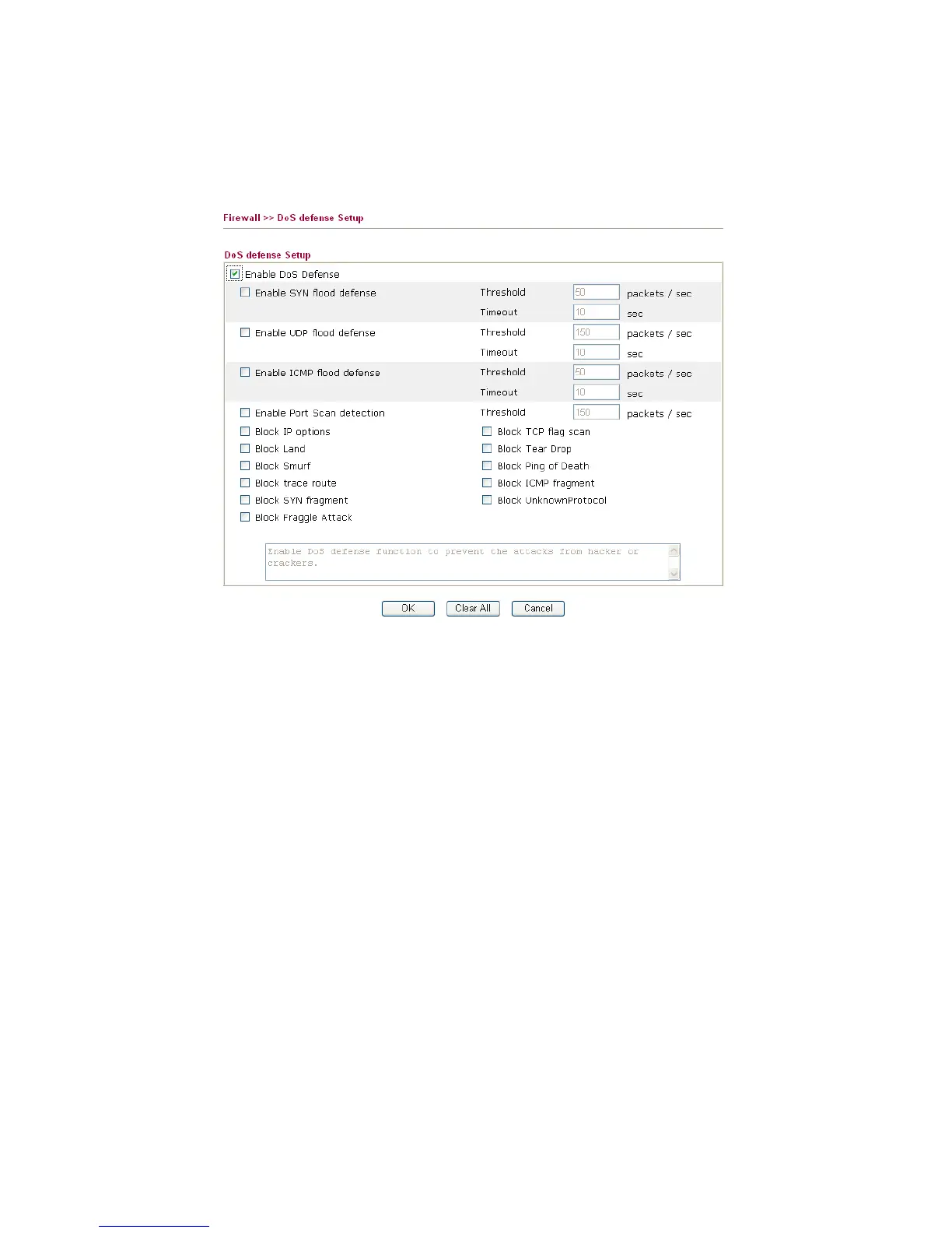 the DoS Defense setup. The DoS Defense functionality is disabled for default.