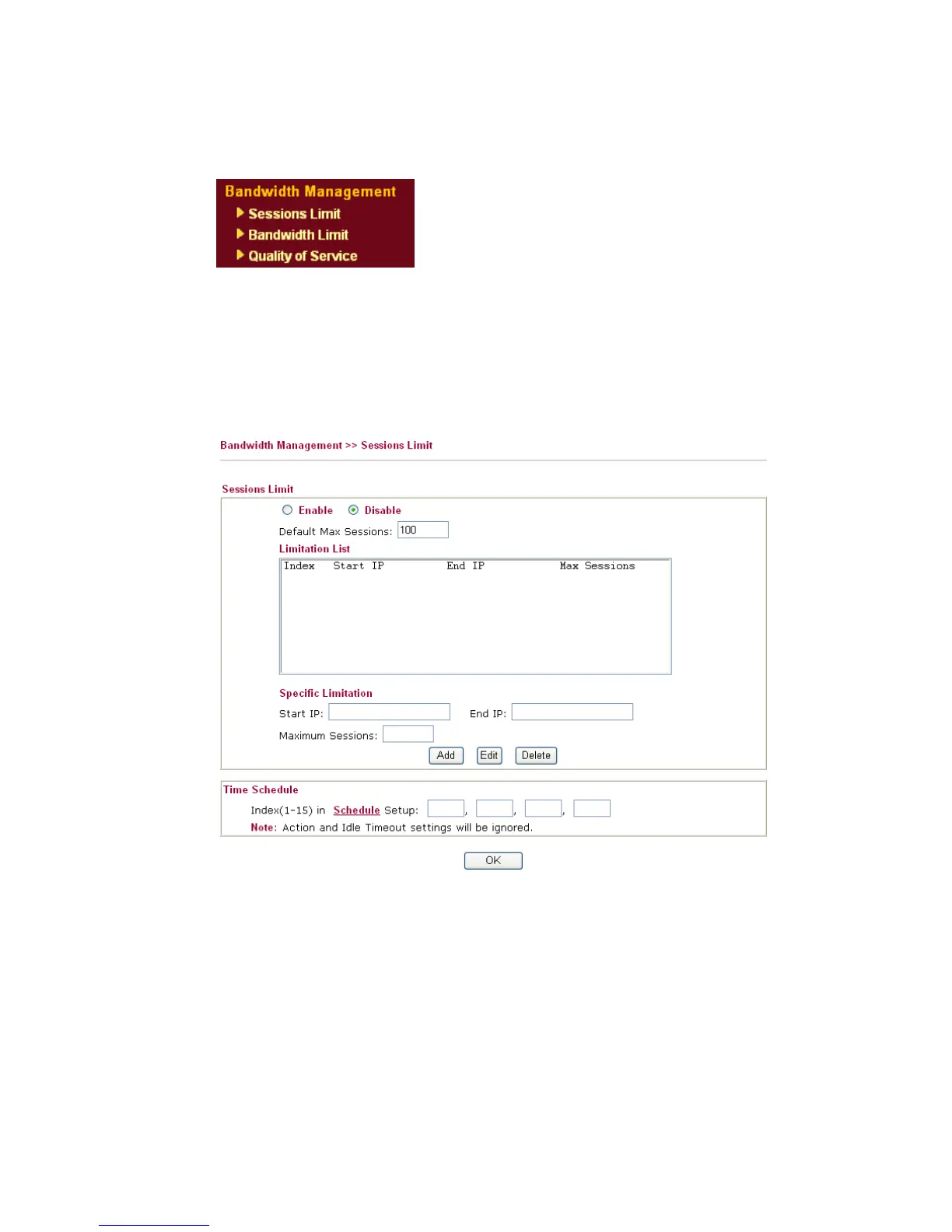 In the Bandwidth Management menu, click Sessions Limit to open the web page.