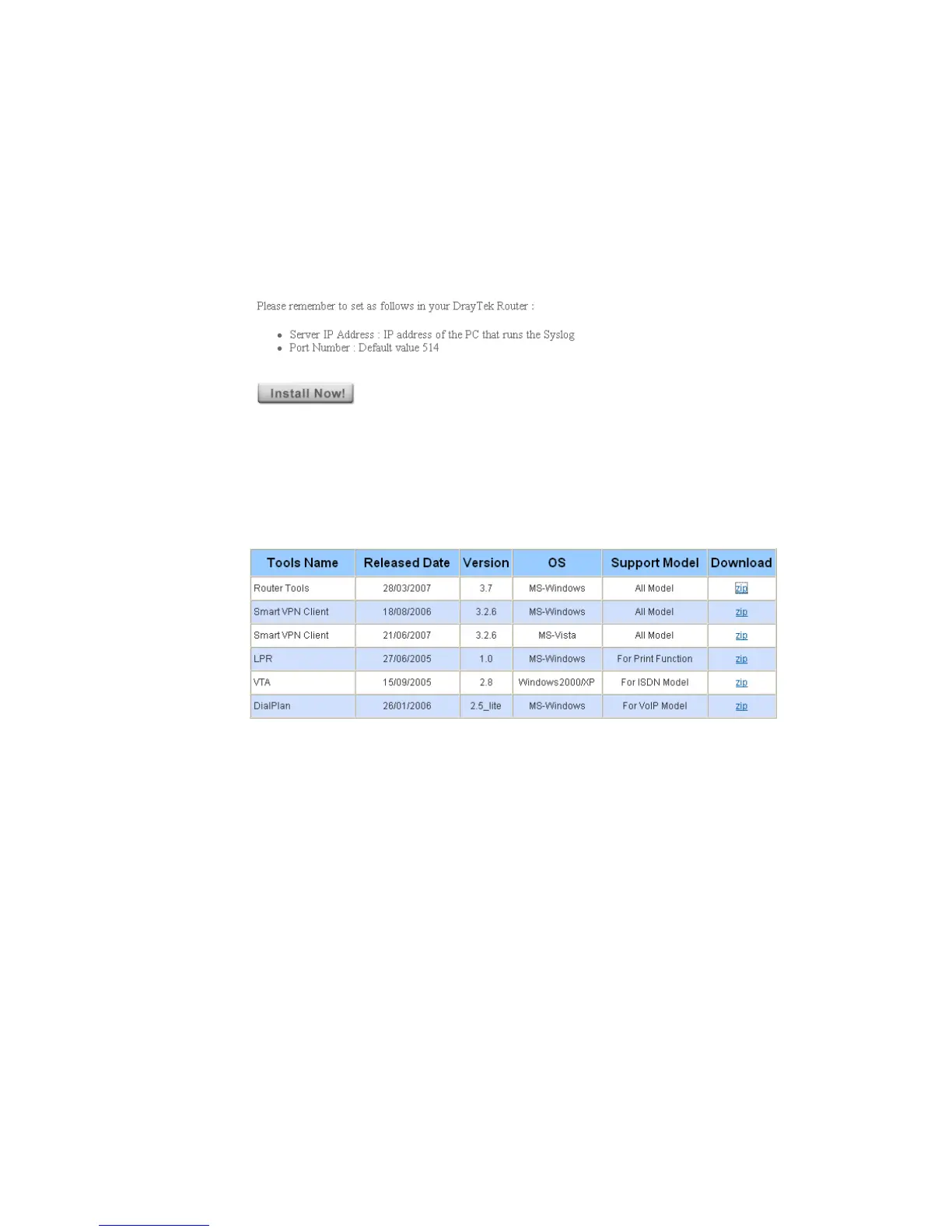 3. On the webpage of Utility, click Install Now! (under Syslog description) to install the