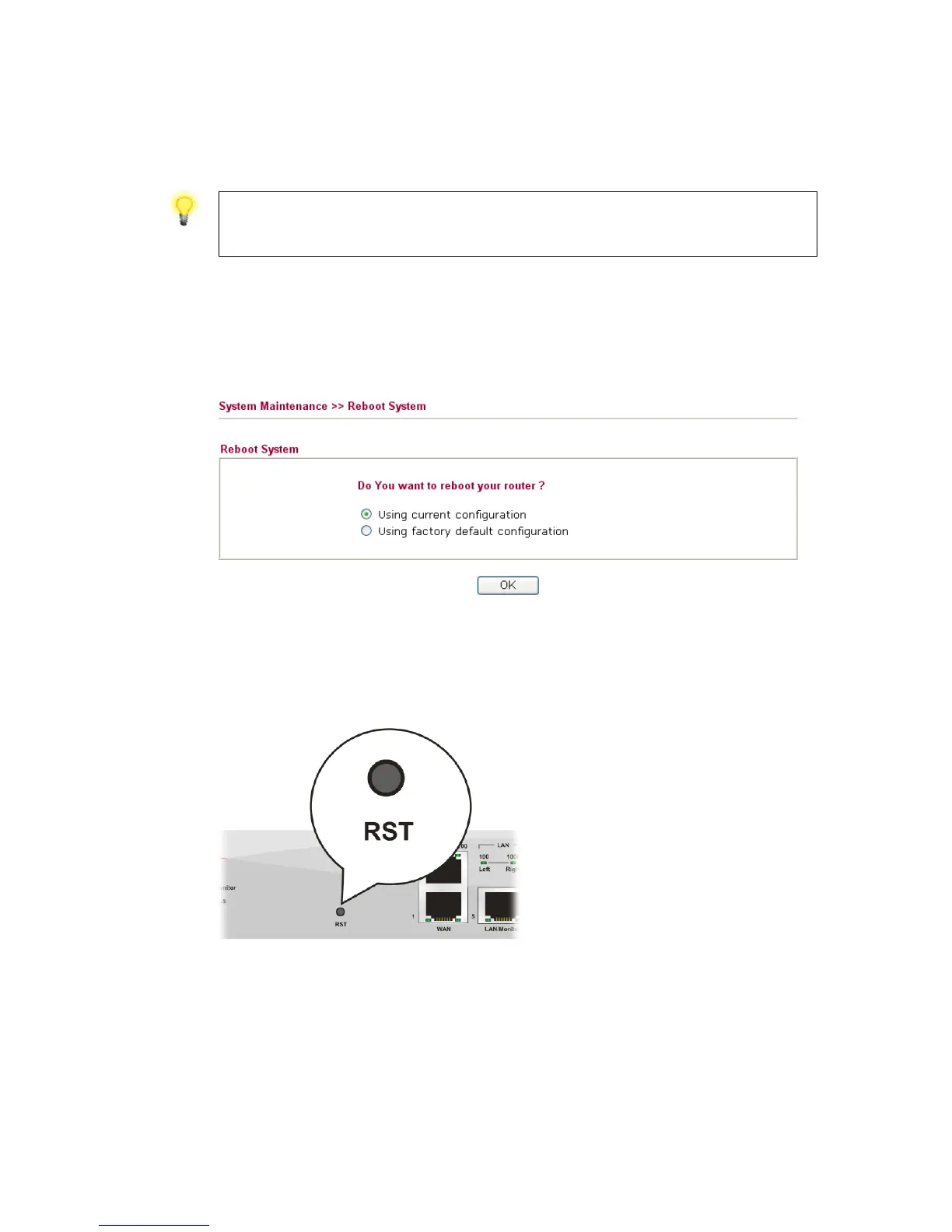 Go to System Maintenance and choose Reboot System on the web page. The following